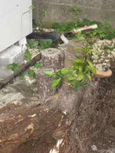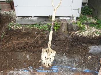 実は、玄関左の、エコキュートを設置した地面には、いつの間にか木が何本か生えていて、小さいうちに何とかしなかったものだから、電線を干渉するくらいにもなり・・・、何回か枝を伐採するも手に負えなかったので、先のリフォームで根から撤去していただくことにしていました。