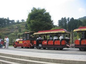 パークセンターの前に、かわいらしいロードトレインが止まり、もうすぐ出発です。