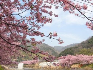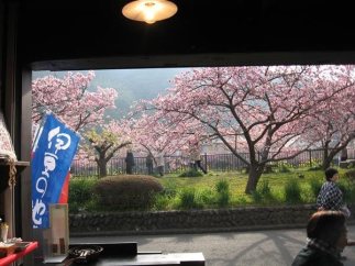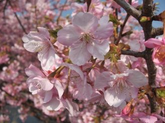 この日の目的は、伊豆の河津の河津桜を見ることでした。多分ここが、河津桜の名前の由来の地かしら?と思いつつ、この市に入ると、早速、河津桜のピンクが迎えてくれ、