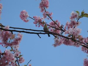 花は、ちょうど満開で、少し葉が出かけているのもありましたが、ところどころにある菜の花と、よいコンビネーションで、春を満喫することができました。ソメイヨシノとはまた違う、桃の花のようなピンク色。花の中を巡るようにして、メジロとミツバチが忙しく飛び回っていました。