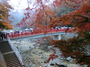 3日目は、愛知県豊田市足助にある「香嵐渓」の紅葉を見ようと出発しましたが、昨日、一昨日の晴天とは打って変わってこの日は朝から雨。目的地に向かう途中には、バケツをひっくり返したような降り方になってきましたが、到着のころには、小止みになり、いくぶん明るくなって来たのはラッキーでした。豊田松平ICから、どんどん山奥に行く感じなのに、目的地はこんな日も午前にもかかわらず、もうかなりの人でになっていました。うまく近くの駐車場を確保し、紅葉見物をすることができました。