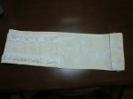 出来上がりは、まあまあ。いざ取り付けようとした時に、何と言うことでしょう!幅が数ミリ小さくて先が入らないではありませんか!厚みを考えなかったからとわかっても後の祭り。アバウトな取り組みが災いしました。やり直すしかないかと、レース装着部分をほどこうとしましたが、ほどくのもなかなかの苦労。