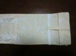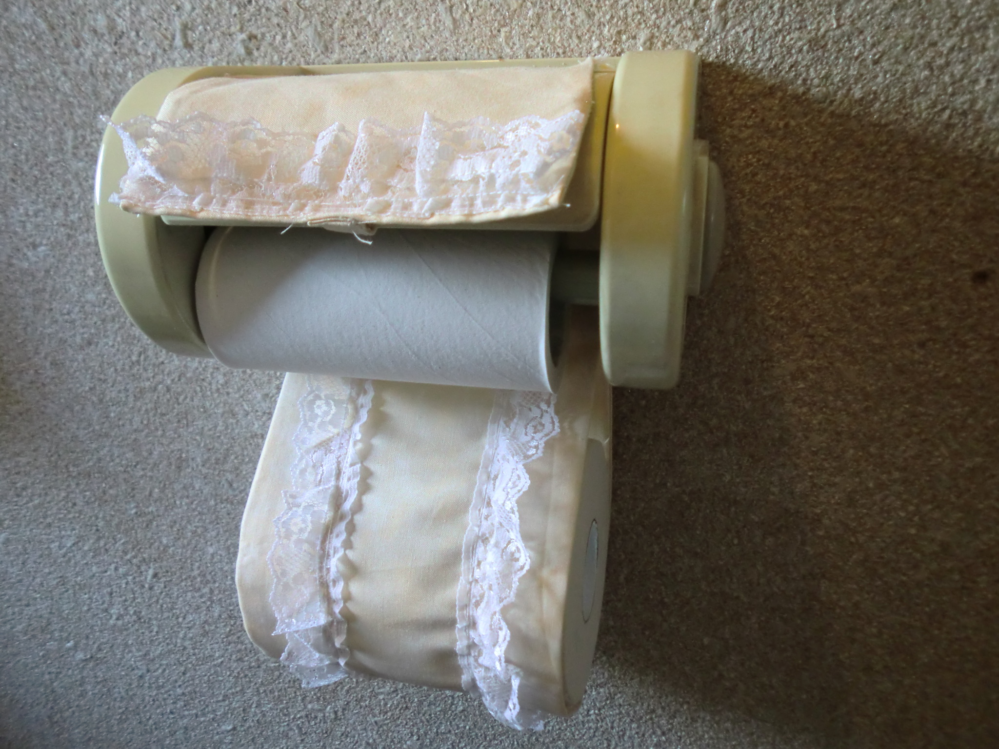 そこで、さらに1Fのトイレのペーパーホルダーがかなり古くなっていることに気づき、これも作ってみようかと思い始めました。思った時が行動の時とばかり、横幅12.5センチ、全長40センチの大きさになるように、布を裁断、考え縫い合わせて何とか出来上がりました。あまり模様のない布だったので前面にはレースをあしらってみました。