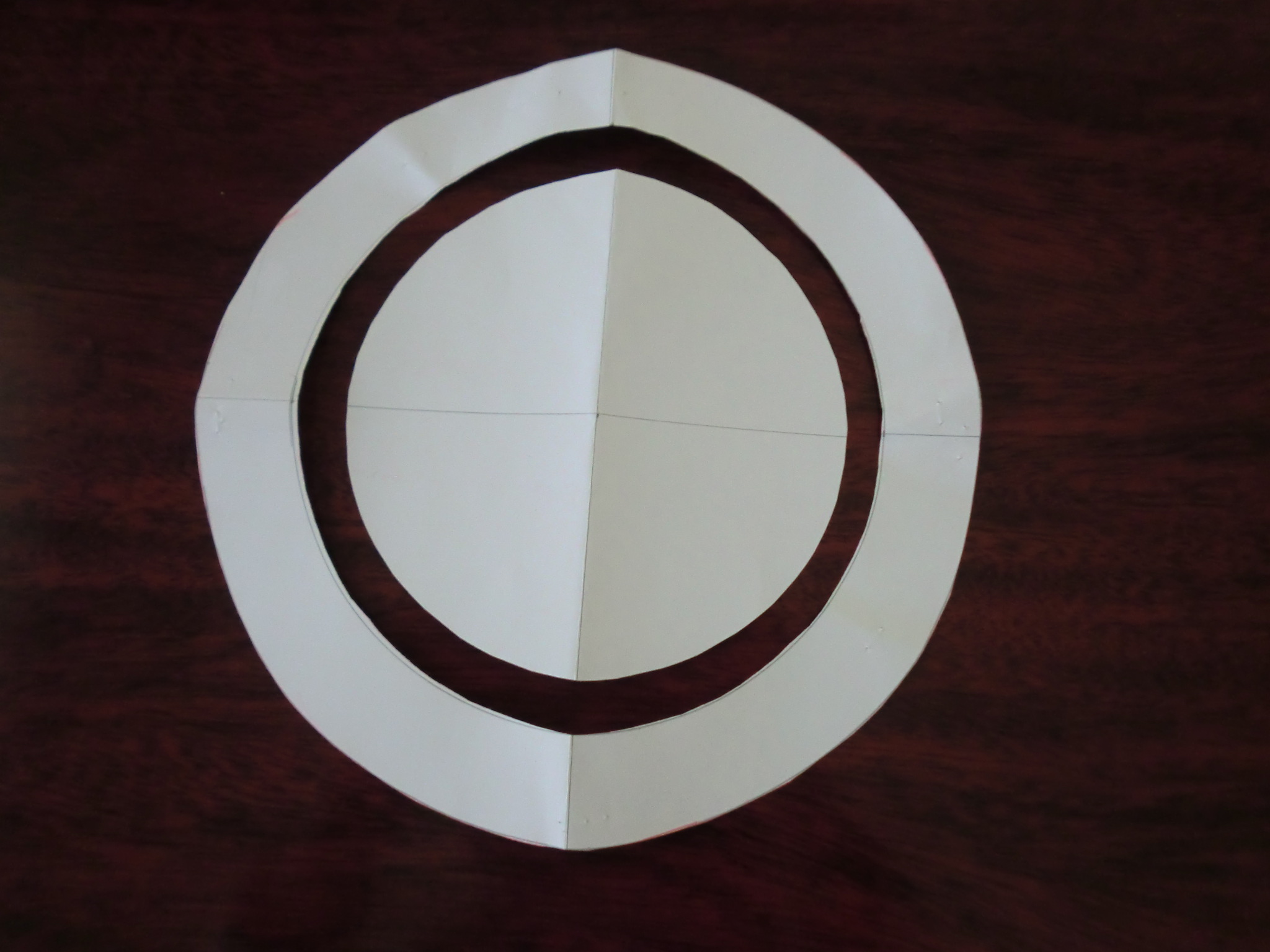 まず、型紙は、このようなものです。直径が21センチの円の中に、半径7センチと8センチの円のところに印をつけ、この間1センチのところが、紐を通すところになります。通し口に、ボタンホールして生地を二重に縫い合わせ縁をパイピングしたら出来上がりです。