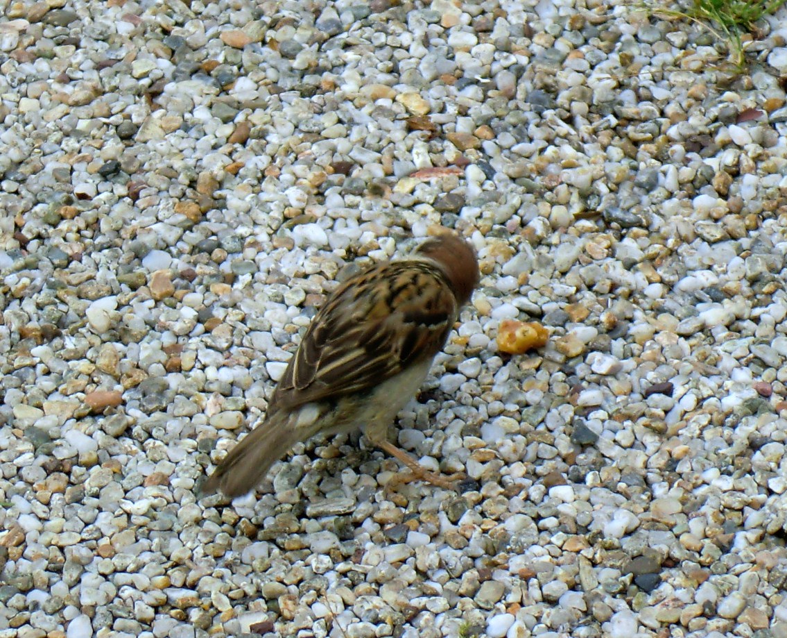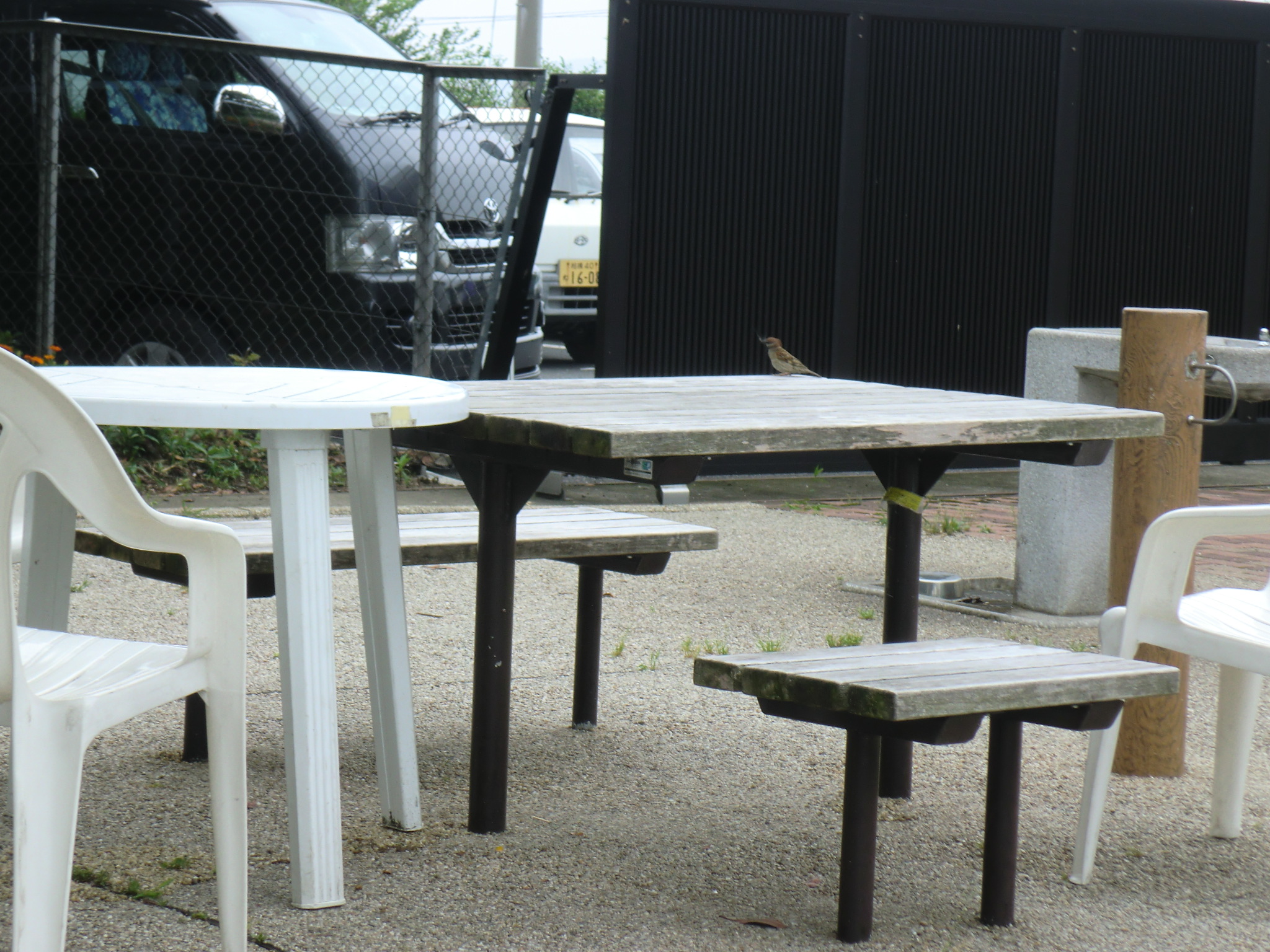 雀がパンくずを食べに時々やってきます。よく見ると、食事が終わって、無人のところには、雀がお掃除していました。