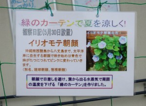 グリーンカーテンを見つけました。イリオモテ朝顔とありましたが、琉球朝顔のことのようです。宿根草で、秋までも長く咲く朝顔です。
