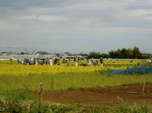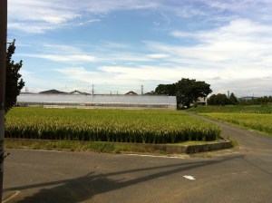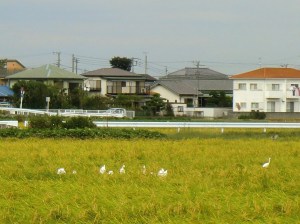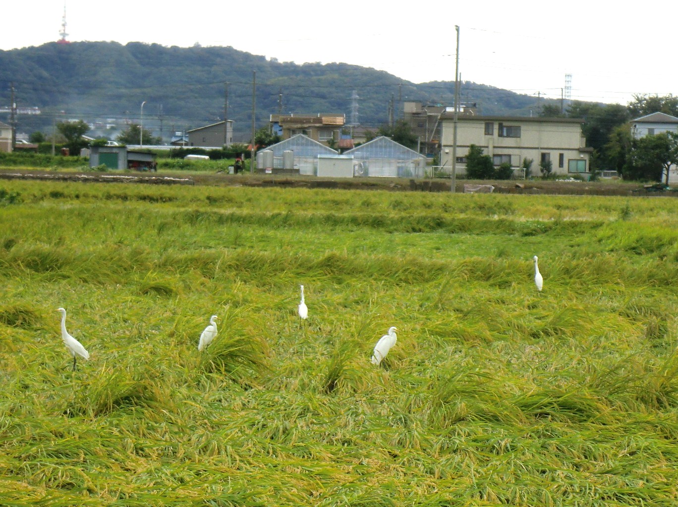 さて、彼岸花群生地へは、ここから東へ移動です。一面の田んぼ。なぎ倒された稲があちこち見える中、しらさぎの姿が沢山見られ、農道を走る私たちに警戒して、通り過ぎると羽ばたいていきます。