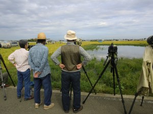 何でも、この時期にしか見られない鳥だそうで、この池の草の茂みにいるのは間違いないので、姿を出した時に写そうと構えているということです。私も、ちょっとデジカメを取り出してみましたが、鳥が潜んでいるのは、向こうの茂みということで、だから皆とてつもなく長い望遠レンズを構えていることがわかりました。近くに止めてある車は横浜ナンバー。遠くから鳥を撮影に・・・何だかとてもロマンを感じました。確かに、鳥はねぐらに帰るために日没までには姿を現すことでしょう。それにしても、気が長いというか、優雅。