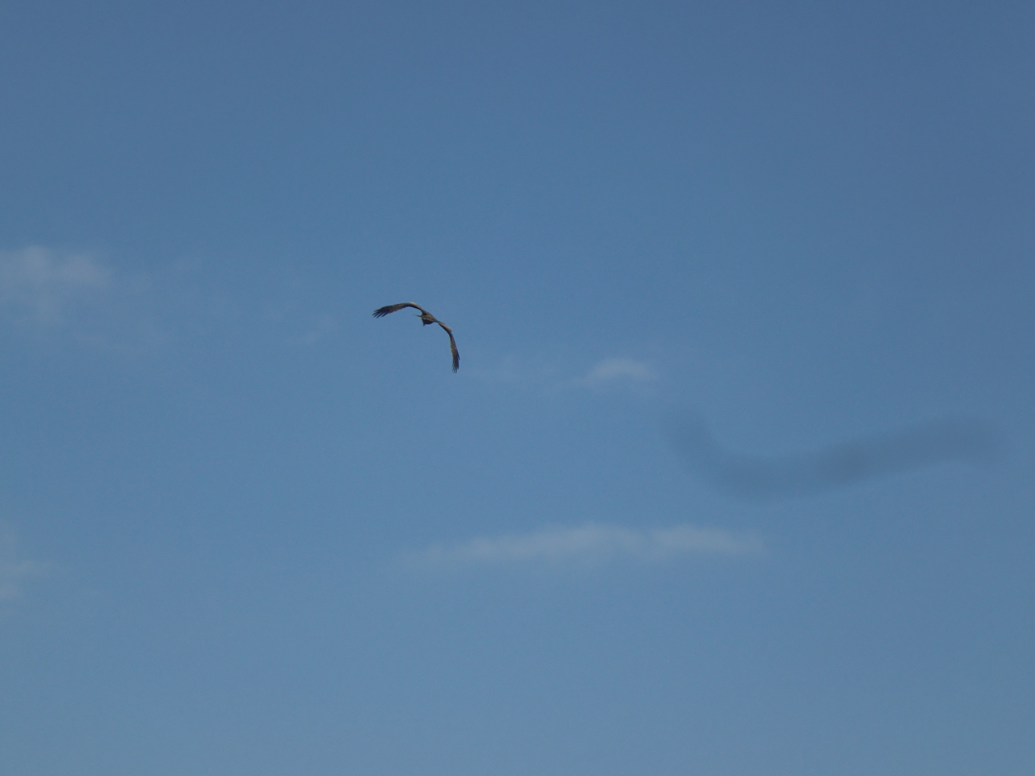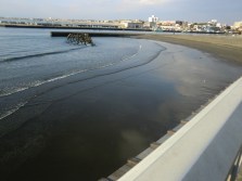 大きなトンビが絶えずえものを狙っていてときどき、低空飛行。 寄せる波の方向・・・、何だか不思議。 遠くの烏帽子岩と湘南平のテレビ塔がかろうじて見えるも、カメラには収まらない・・・。