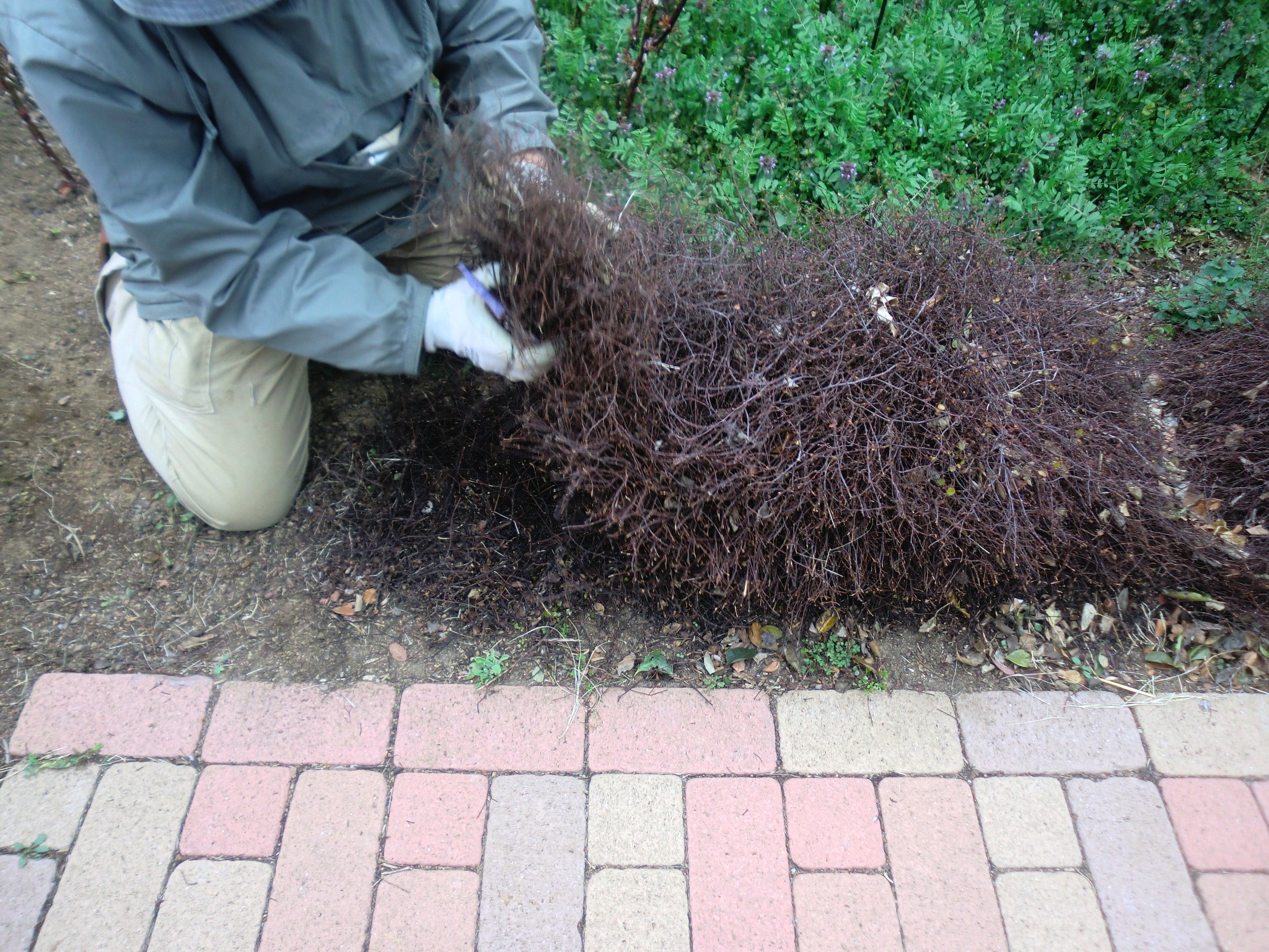 バラの、根元には一足早く芽吹いた、春の草が生えていてそれらを一掃することと、エッジのところにうえてあるすっかり枯れているワイヤープランツを切り戻しする作業です。