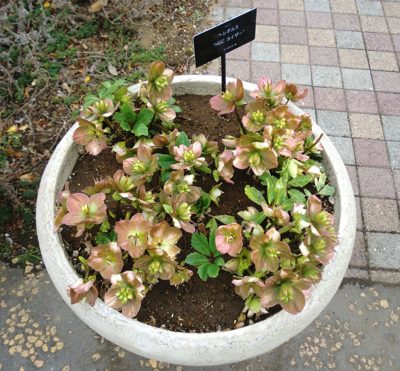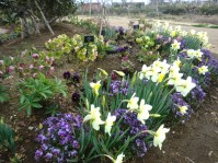 しばらくの間に、花菜ガーデンはすっかり、春色になっていました。春爛漫とまでは行ってませんが、ハナモモのピンク、菜の花、ラッパ水仙の黄色、様々にグラデーションをなすビオラ、パンジーなど。クリスマスローズは、大人色の落ち着いた色合いで・・・