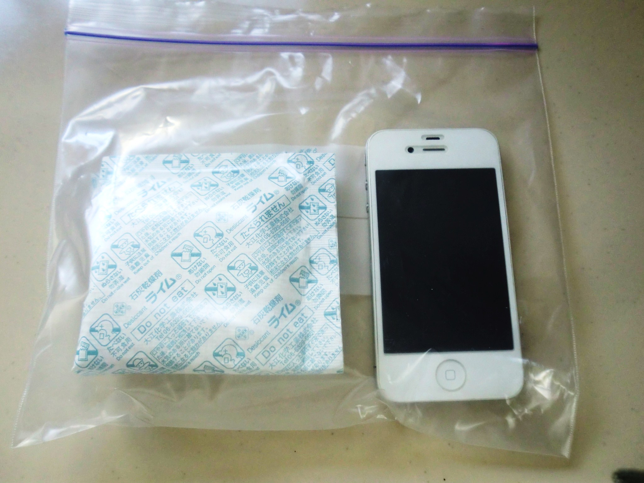 さっそく、ネット検索で事例をさがしました。すると、水没後の処置として、真っ先にすることは、電源を落とすことで、その後水分をしっかり除去して、4日間くらい乾燥剤を入れた袋に入れておくのが良かったようでした。もう2日も使ってしまったけど大丈夫だろうか、他の機能が仕えても、肝心の電話機能が無いのは放っておくわけにはいきません。