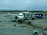 2時間弱のフライトで、新千歳空港に降り立ちました。到着すると「ただいま北海道は、1年でもっともよい季節を迎え、花や緑がきれいです」のアナウンスが流れて来ました。天気は薄曇り。外に出ると、涼しいと感じる気温でした。