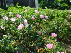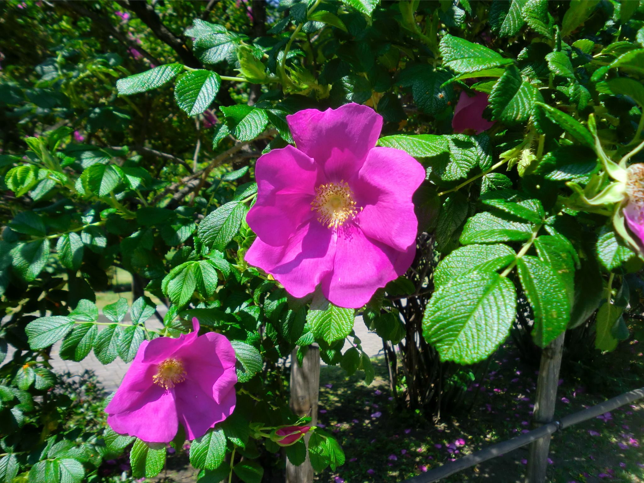 あちこち歩いていて、気づいたこと。 何だかいつも白いゴミが舞っている・・・(と思ったら何かの花びらみたい、アカシアかな?)。それと、きれいなピンクの花が咲いている・・・(一重のバラかなと話していたら、それはバラとハマナスの交配種ということでした)。