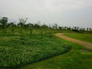 そのころは、風車が取り去られたあとのセンターフィールドは、まだ土が見える感じで、バラは葉ばかり、はなももが咲き始めて、春を感じる風景でしたが、2ヵ月も足を運ばなかったので、花の季節が2,3ページ進んでしまったようです。緑は、厚みを増し、バラの饗宴はピークを過ぎて・・・。