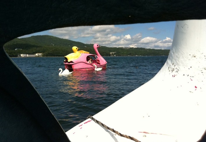 予定通り山中湖で昼食をしたあとは、いつもなら帰路を急ぎますが、今回は諏訪湖での湖散策の名残から、ぶらっと湖へと歩きだしました。・・・で、今までは、あまりやらないスワンの足こぎ舟に乗ろうと意見がまとまり、3人で初体験をすることになりました。