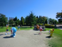 「おとぎ公園」は、全体としては植物園&大きな緑地公園という感じで、自由に入って行けます。しばらく行くと、土管公園はすぐにみつかりました。朝早い時間で、暑い季節ということもあり、ほとんど人はいなかったので、気兼ねなくドラえもんの仲間たちをカメラに収めることができました。