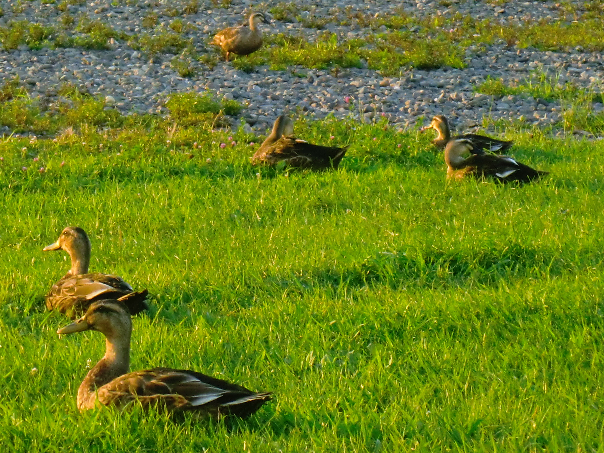 近くを散歩すると、水鳥たちが岸辺で遊び、さらには芝生の上に上がって日向ぼっこをしていました。人を観ても逃げる様子はありません。