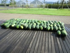 今年の1番の豊作は、何と言っても冬瓜です。大きなスイカほどもある俵形の冬瓜がごろごろ収穫されて運ばれてきました。