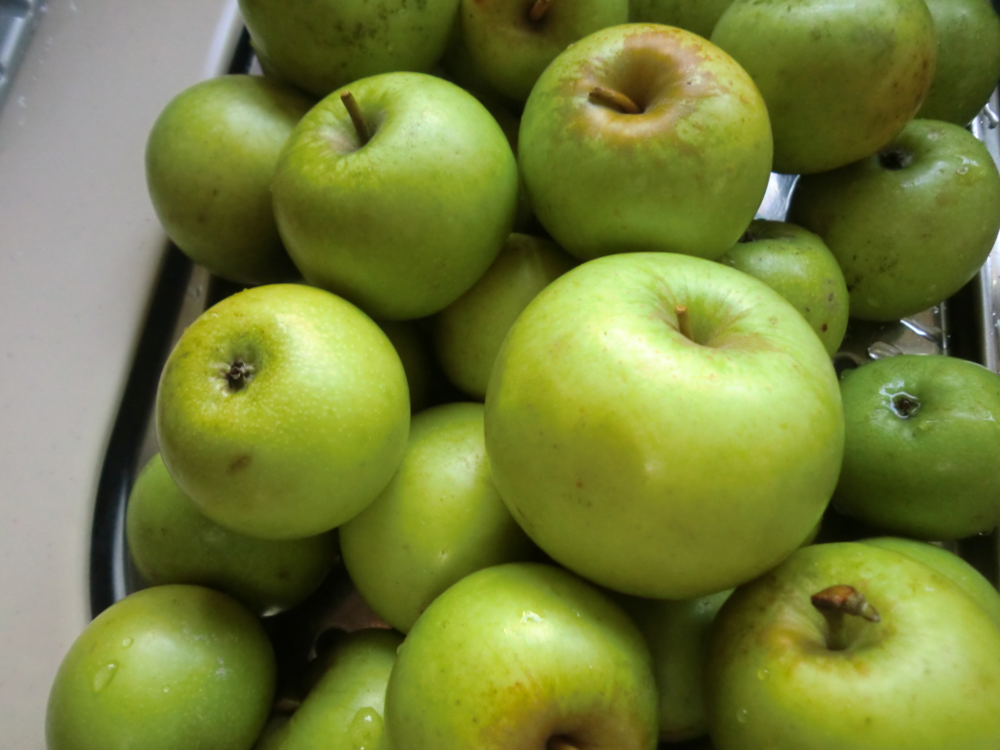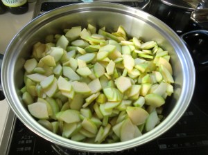 こんなりんごの山を見ると、たちまちジャムを作りたくなります。ジャムは、毎年秋に紅玉りんごを注文して作っていましたが、今年は一足早くのジャム作りです。しかも青いりんごだから、どんなジャムができるでしょう。