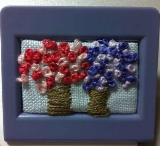 マグネットの柄を刺繍する小品です。こんな風にと見せられたのと同じ感じの色違いに刺したつもりでしたが、できた私の作品は、かなり大ぶりな元気な図柄になってしまいました。これって、やはり性格が出るのでしょうか。