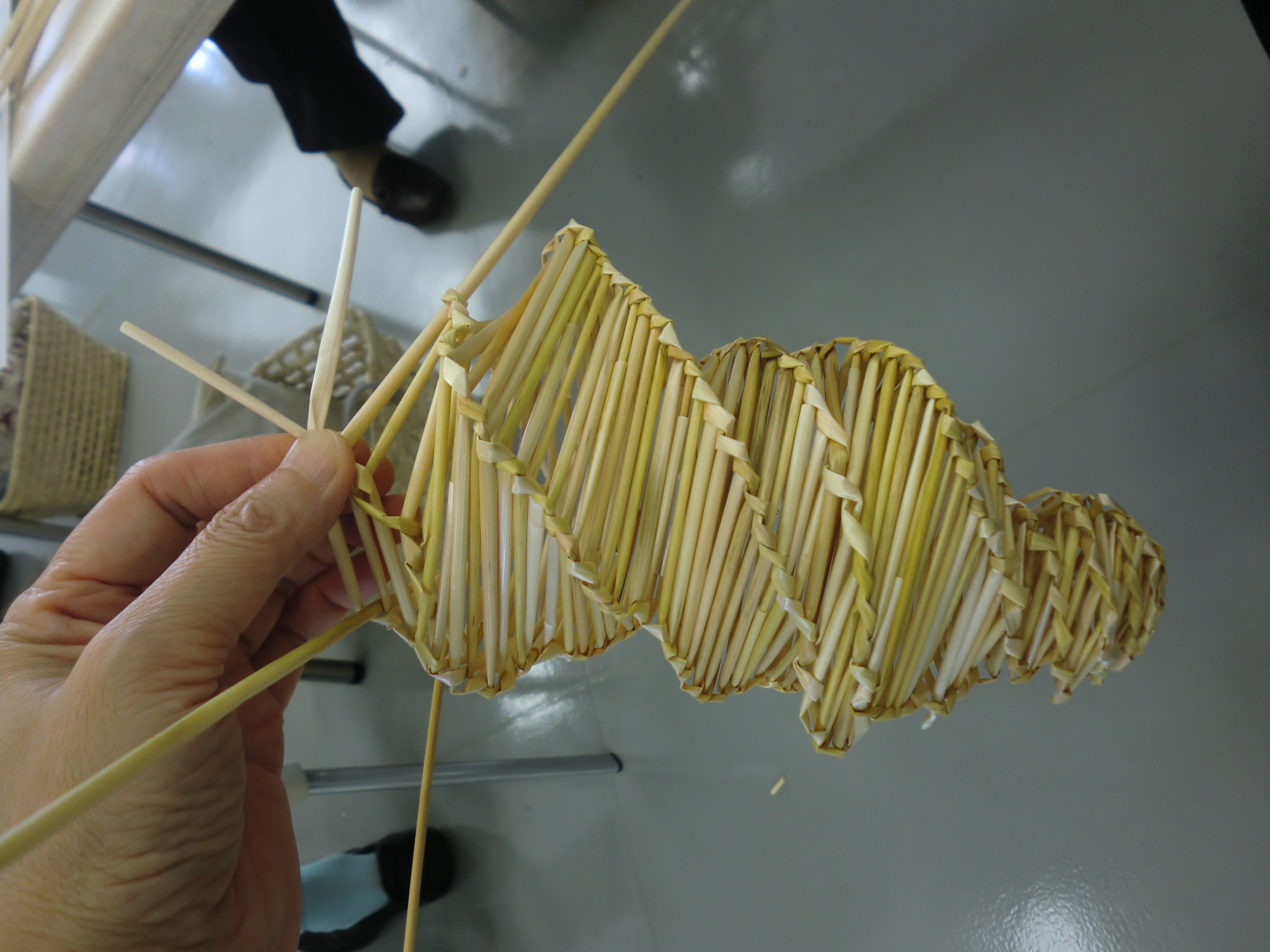 さて、肝心の麦わら細工の籠の方は、はじめ3本の麦わらを中心で重ね、いちばん後ろの麦わらから上下折り曲げるのを3回。そこから、横へ横へと折り曲げてぐるぐる進んで行けばその折具合で様々な大きさが作り出せ、籠が完成します。いとも、簡単風ですが、簡単なものほど奥が深いものの1つにこれも上げられるかもしれません。世界に1つしかできないような手工芸品というのは、設計図があれば同じものを量産できるようなものとはまるで違っています。