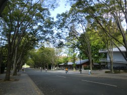 仁王立ちした守衛さんの横を普通に通って、中に。妊婦と初老の組み合わせはどうみても大学に似つかわしくないですが、何もおとがめはありませんでした。大学の中は、思っていたより広々として、緑が多く、お散歩にはうってつけの場所でした。しばらく歩くと、洒落た喫茶がありましたがドトールとわかり、お昼はもう少し学食らしいところで食べました。カフェテリア方式、後の会計です。かき揚げ野菜うどん250円、チョコケーキ180円とリーズナブル。あとで、学内案内を見たら、食堂はあちこちに点在していました。