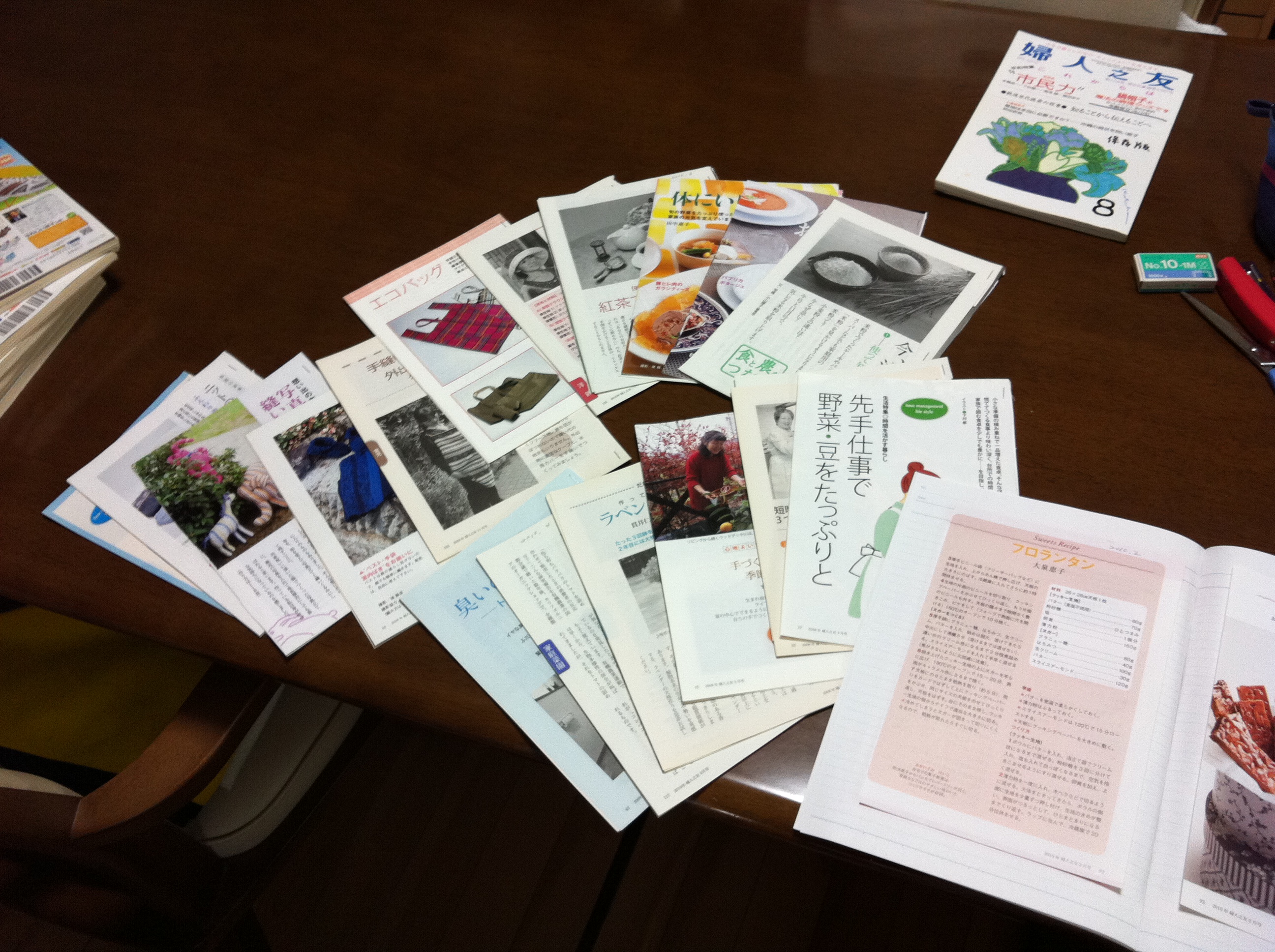 私のチョイスの傾向は、お菓子のレシピ、手芸、洋裁、工芸品などの作り方、料理に関しては、効率よく作れる裏技的な知恵、季節の料理、身近な野菜の植え方のコツ、あと色彩の美しいページなどです。あまり関係ないと流していた育児のページもよくみると、長女に役立ちそうなものがいくつかあったのでチョイスしておきました。健康の記事なども、1つのことを取り上げて詳しく書かれているので、必要なときは役立ちそうですが、これは思いとどまりました。