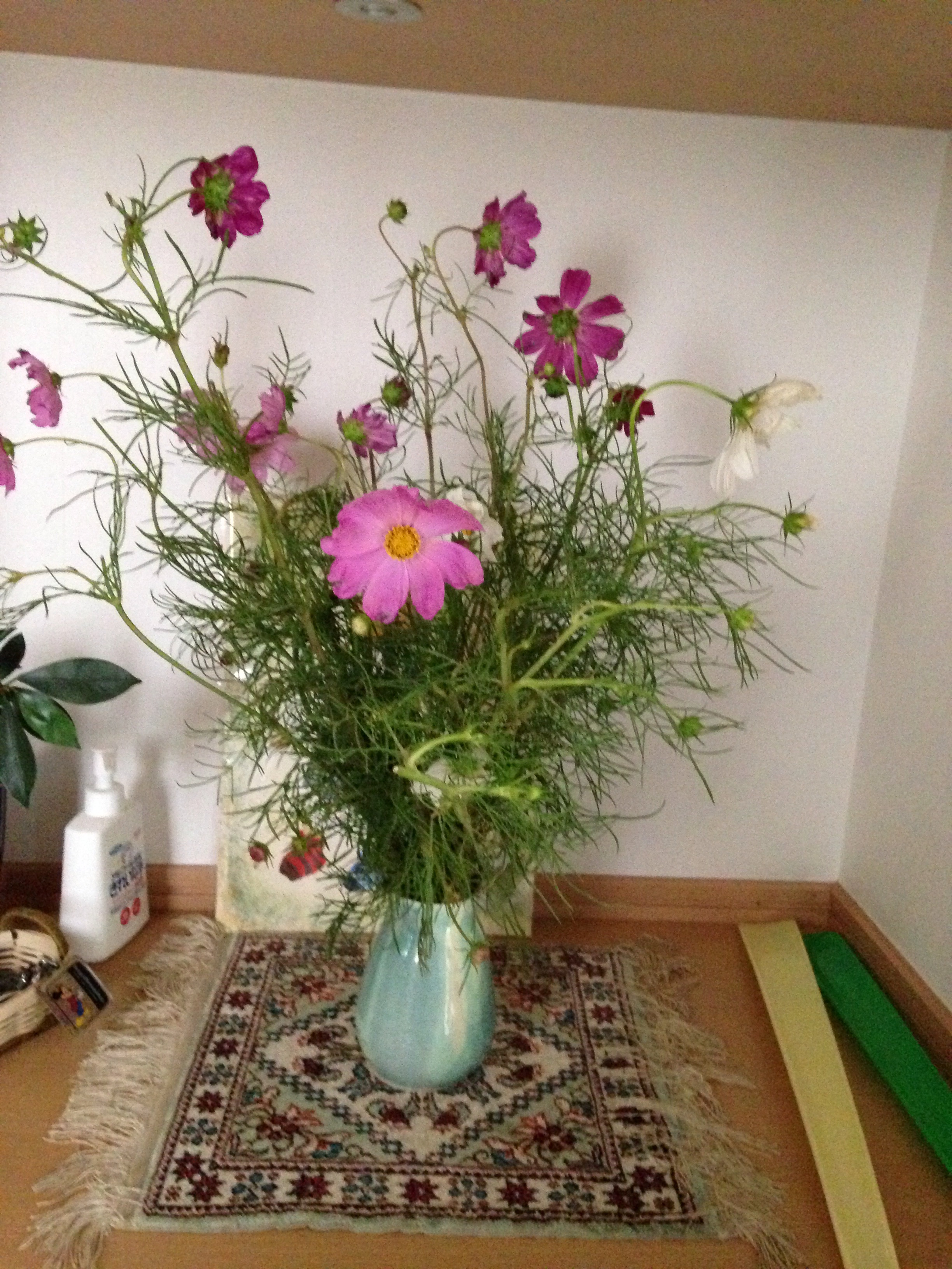花瓶のコスモスは、しっかり水を吸い上げて元気にいてくれています。