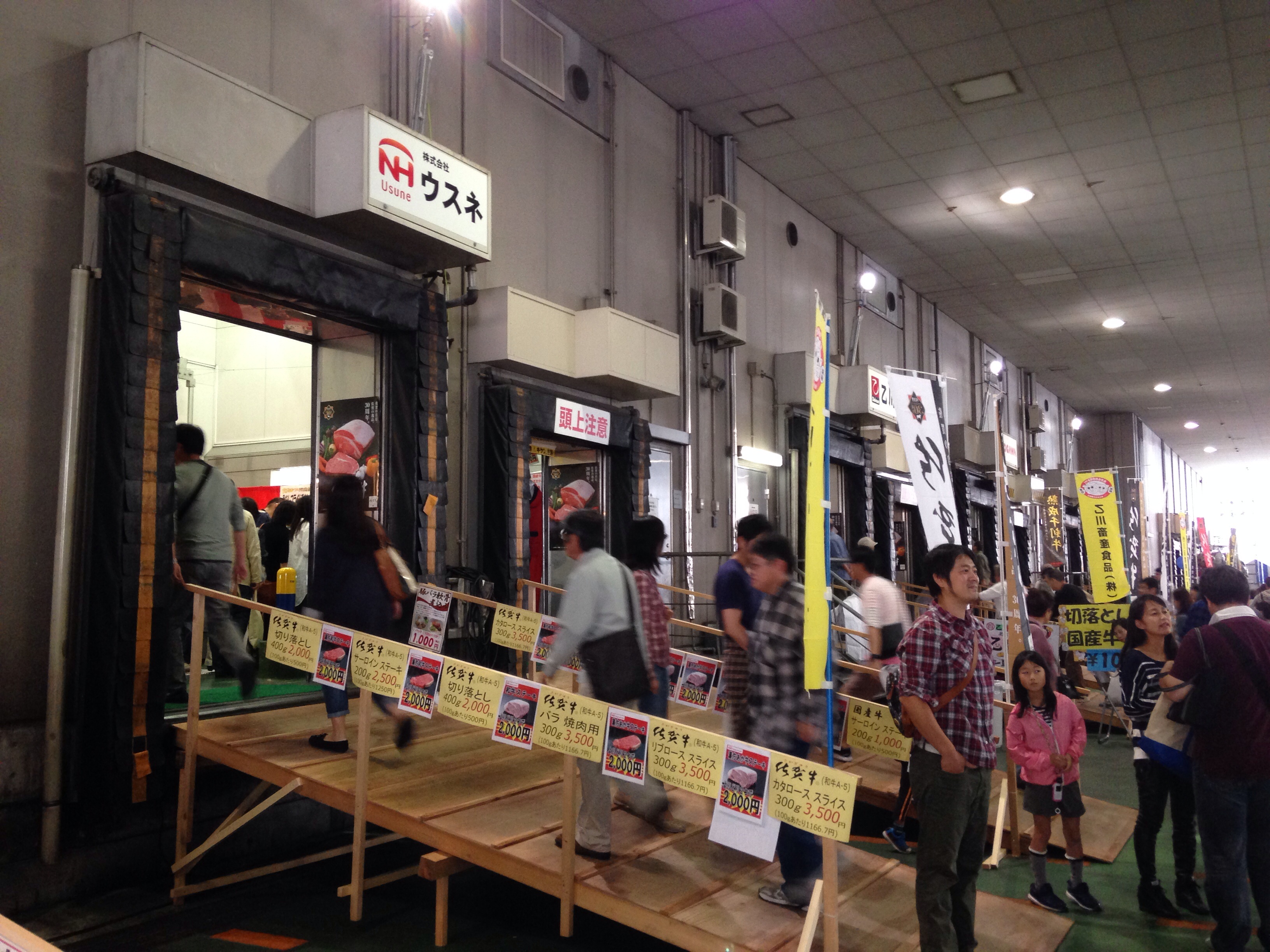 川崎駅でようやく座れ、品川駅をリサーチしました。食肉市場は確かに駅の南側すぐのところです。そして、その辺りのビル群と緑地帯は、数年前東海道ウオーキング、品川宿のときに1回通ったことのある場所でした。催物会場到着は11時を過ぎていたので、もう人がいっぱい集まっていて、試食ブースは長蛇の列、終了のものもありました。肉の販売コーナーも買い物の人でごった返していましたが一回りして雰囲気だけ味わって、出てきました。