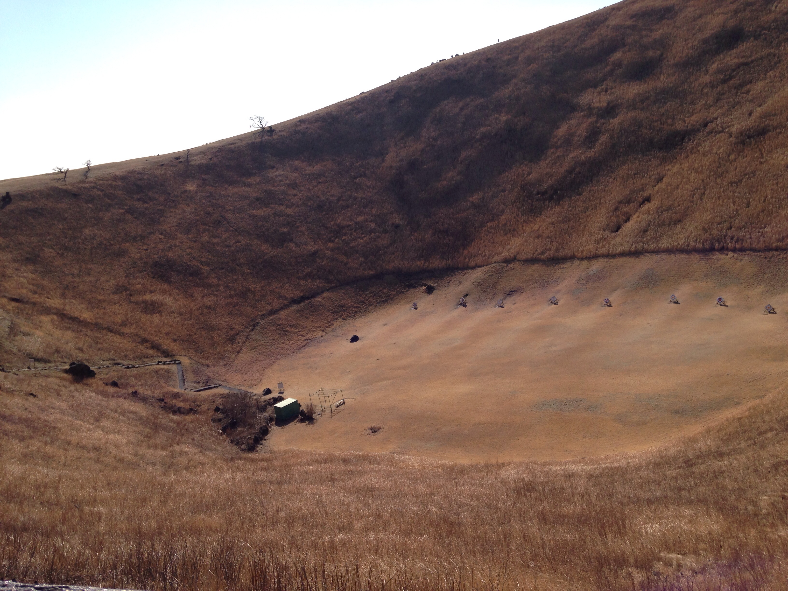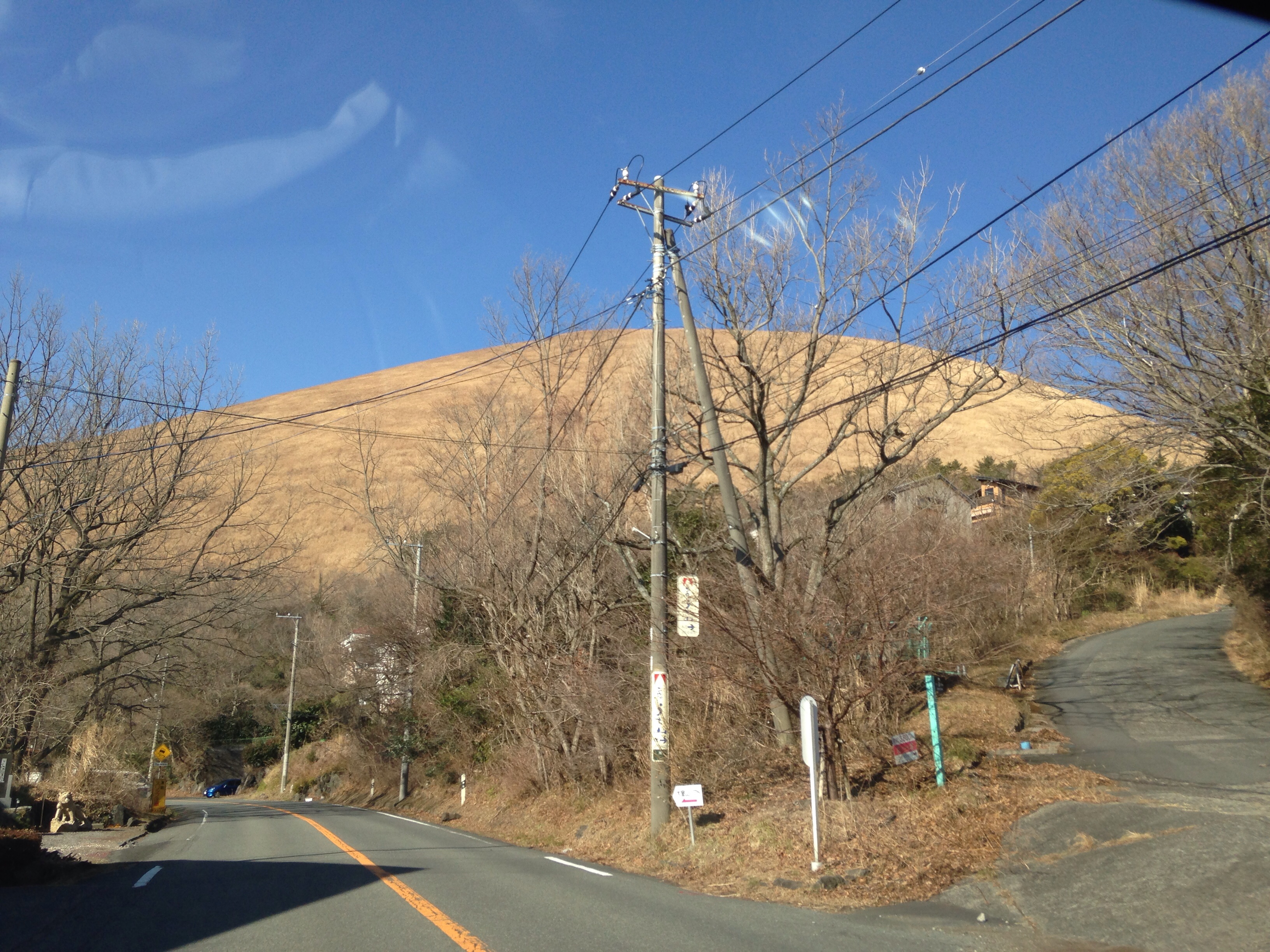 翌日は、10時のチェックアウトぎりぎりまで、ホテルの周辺散策などをして、出発しました。どこか1カ所だけ観光しようということになり、帰路とは反対方向の大室山に向かいました。パンフレットによると、大室山は3700年前の噴火によってできた直径1000m,高さ300mのプリンのような形の丘ということで、頂上には小さいながら火口があり、その周りをぐるっと回れるとのこと、そしてそのすり鉢状の山頂にはアーチェリーができるようになっているということでした。そして、富士山と大室山は姉妹ですと書かれていて、なんと素敵!と思い行ってみることにしました。