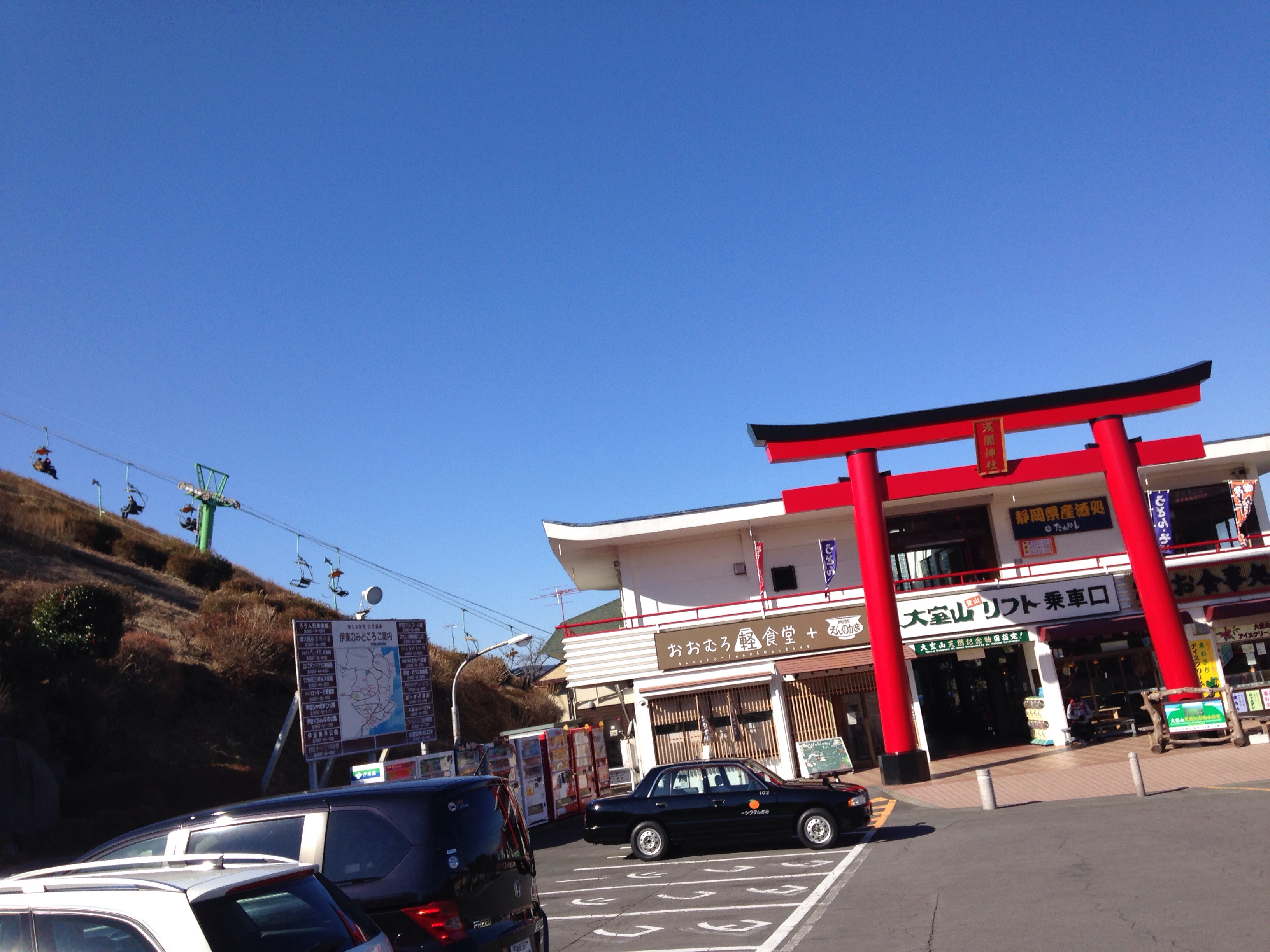 大室山の特徴として、山肌に木は無く草ばかりでその全部が保護されているので自由に立ち入ることも登ることもできません。それで、頂上へはリフトに乗って行くことになります。リフト発着場は大きな鳥居の向こう。浅間神社の管轄なのでしょうか?頂上に祭られている神様は、富士山に祭られている神様の妹にあたるそうなので、姉妹のいわれはこの辺りから来ているようです。