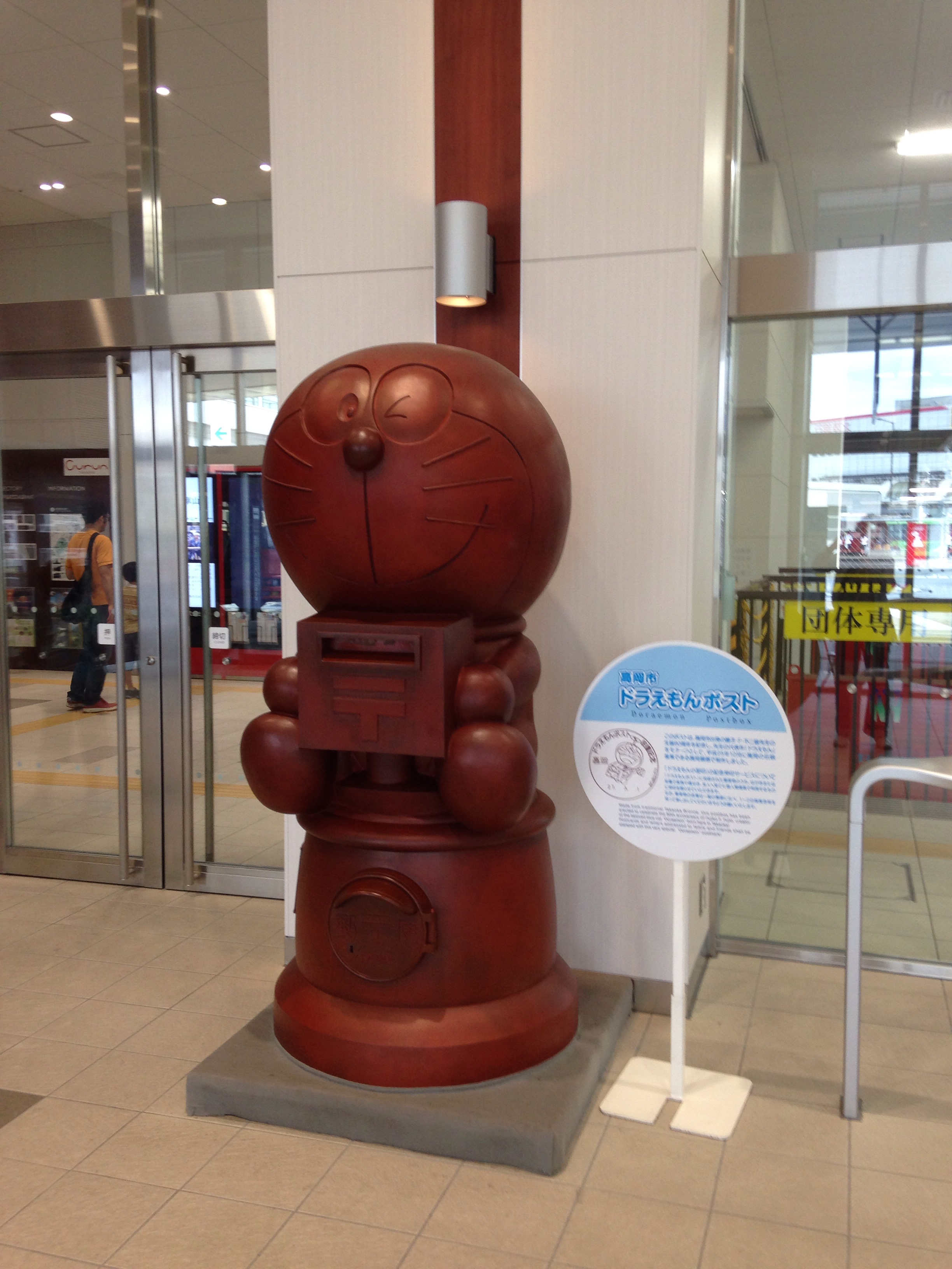 JRの駅は2階ですが、1階の横には、路面電車(万葉線)の駅があり、その待合室にはドラえもんのポストがありました。ここから投函すると、ドラえもんのスタンプが押してもらえるとのこと。