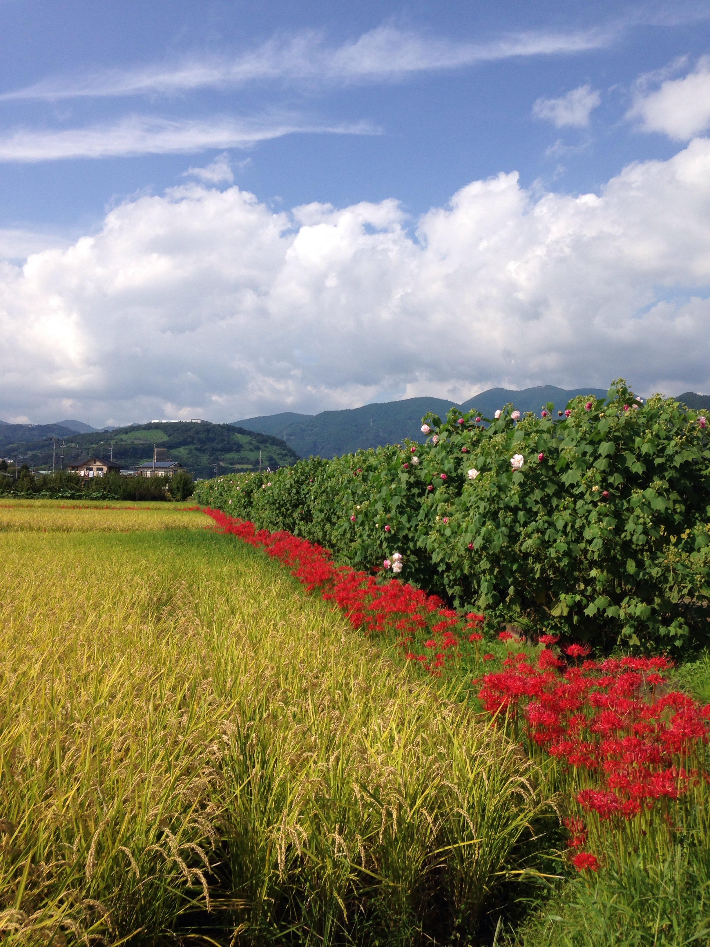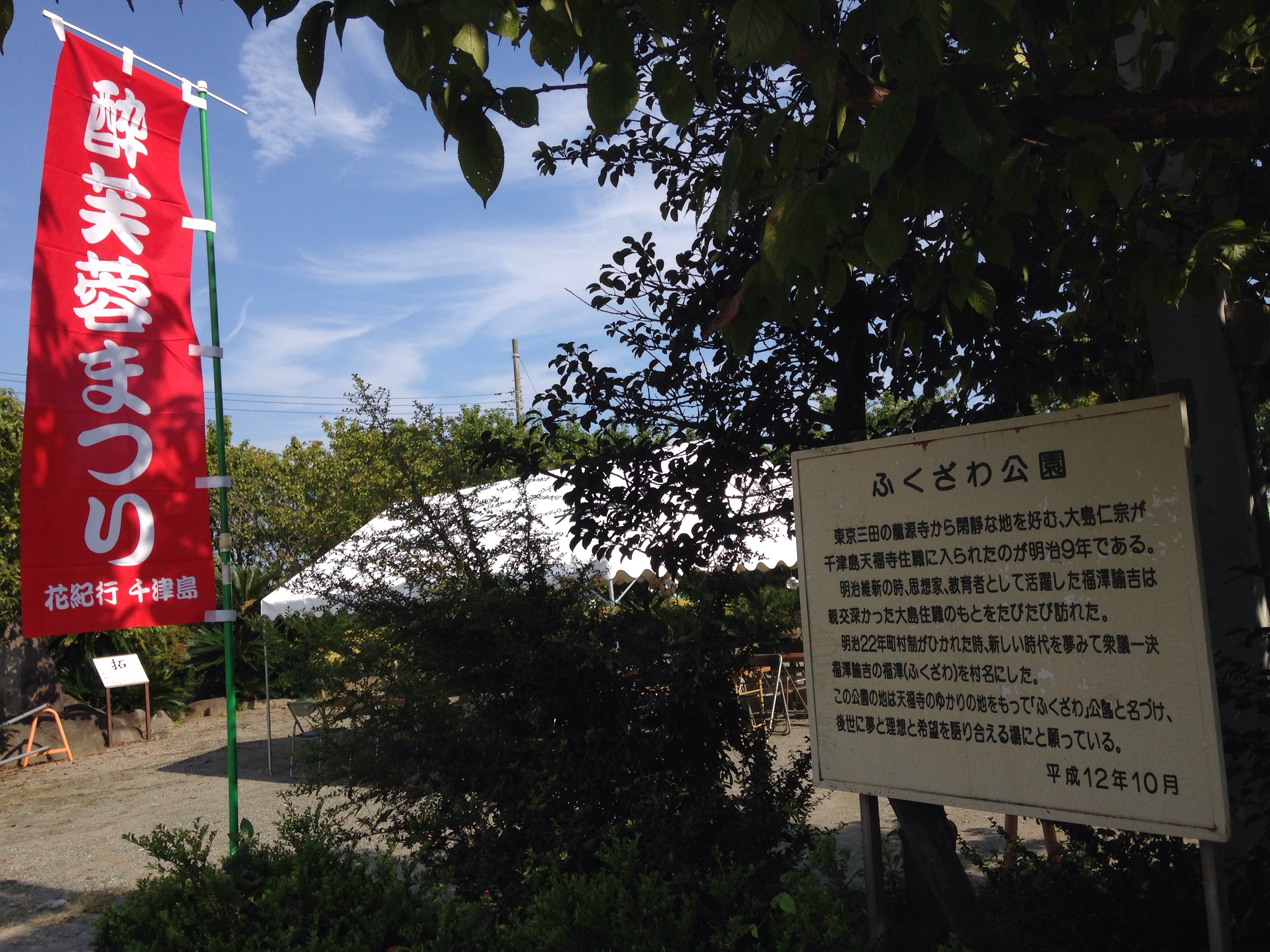 「福沢公園」はほどなく見つかりましたが、今日はこの辺一帯、酔芙蓉祭りというのが行われていて、酔芙蓉が両側に並ぶ道が南北に長くありました。ぐるりを取り囲む田んぼは収穫の時を迎えていて、そのあぜ道には、くっきり赤い彼岸花が鮮やかに咲いていました。