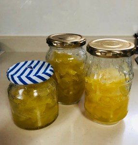 2個の文旦で、ジャムの瓶3個分が出来上がりました。保存用の瓶は、予め熱湯消毒して、使います。