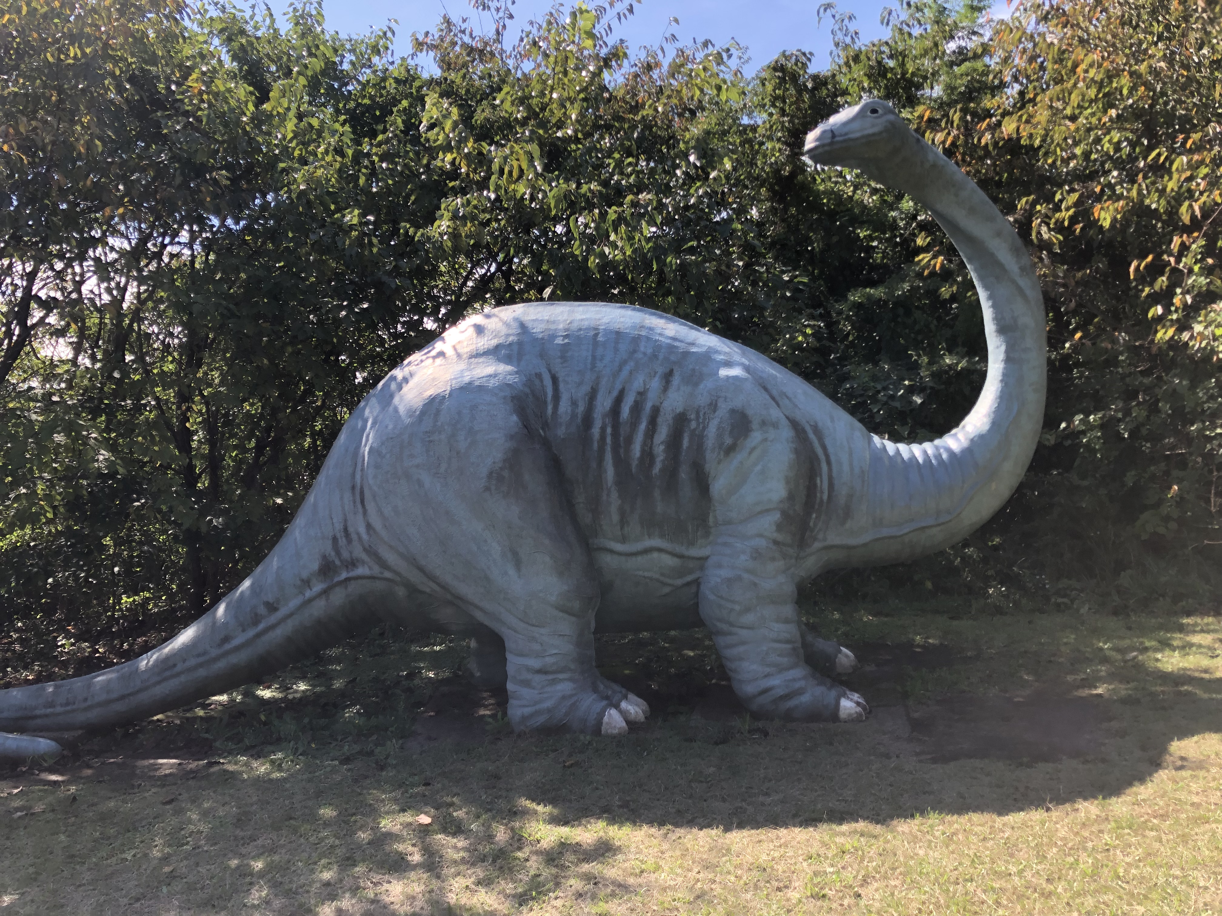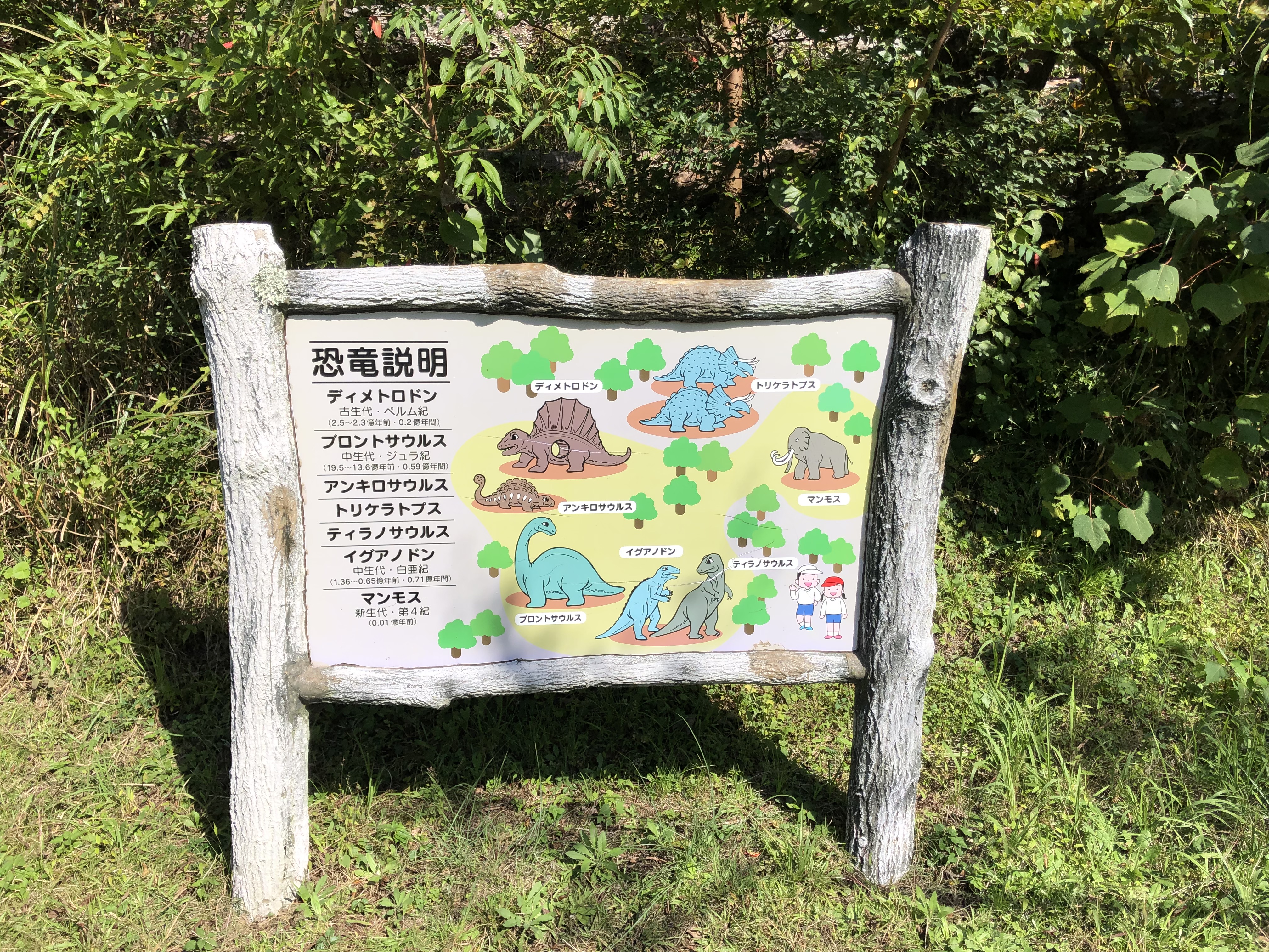 小室山はリフトを使わなくても、下まで降りる道が二通りあり、恐竜が見られるという方の道で降りました。山の児童公園の中に、原寸大かと思われる代表的な恐竜のモニュメントと説明があちこちに点在するエリアがあり、そこを抜けるとずっと下まで階段が続くというルート。この下り階段のせいか、翌日ふくらはぎの筋肉痛となりました。この小室山公園のふもと付近は、春にはつつじが咲くというエリアが広がっていました。