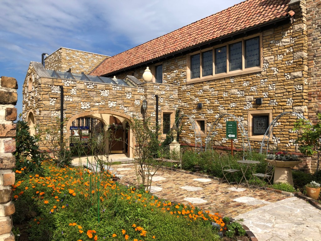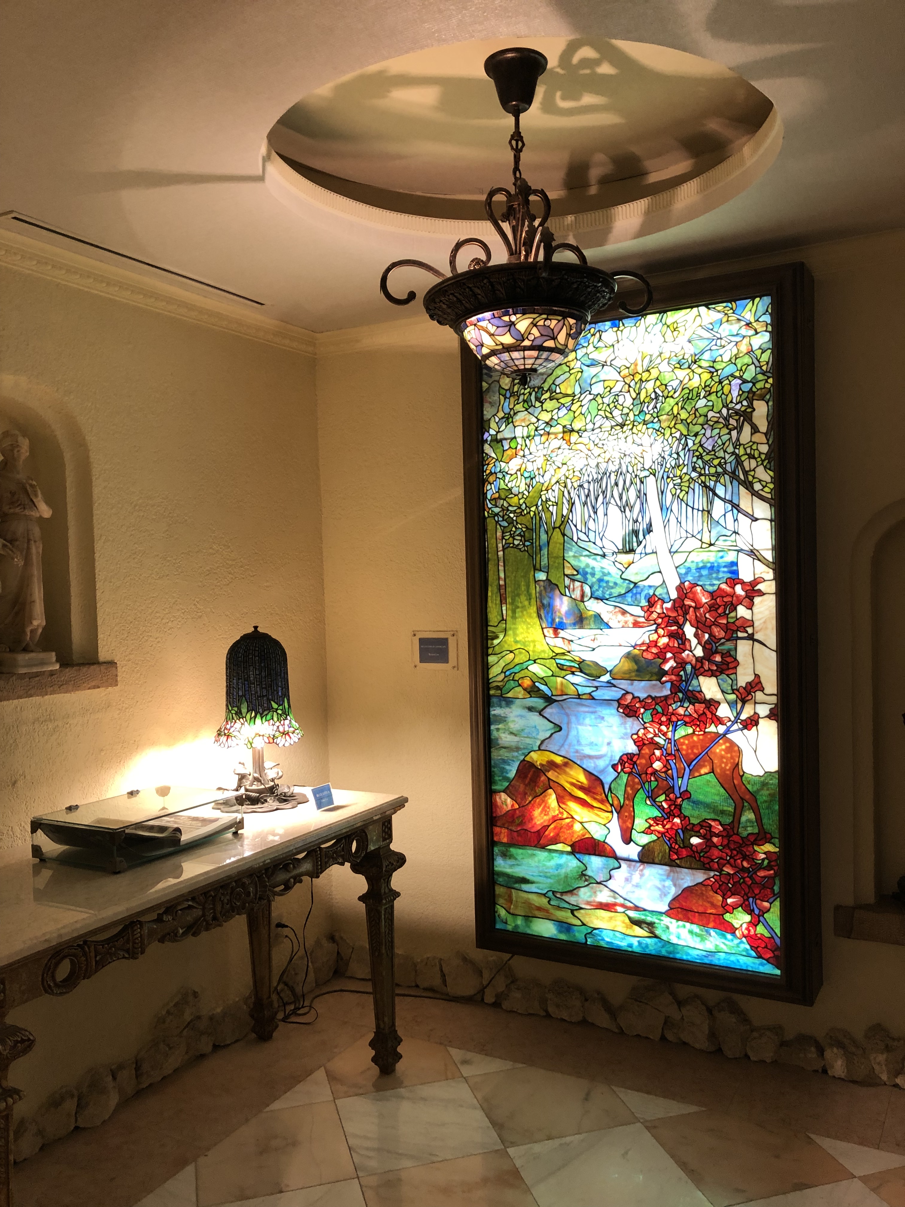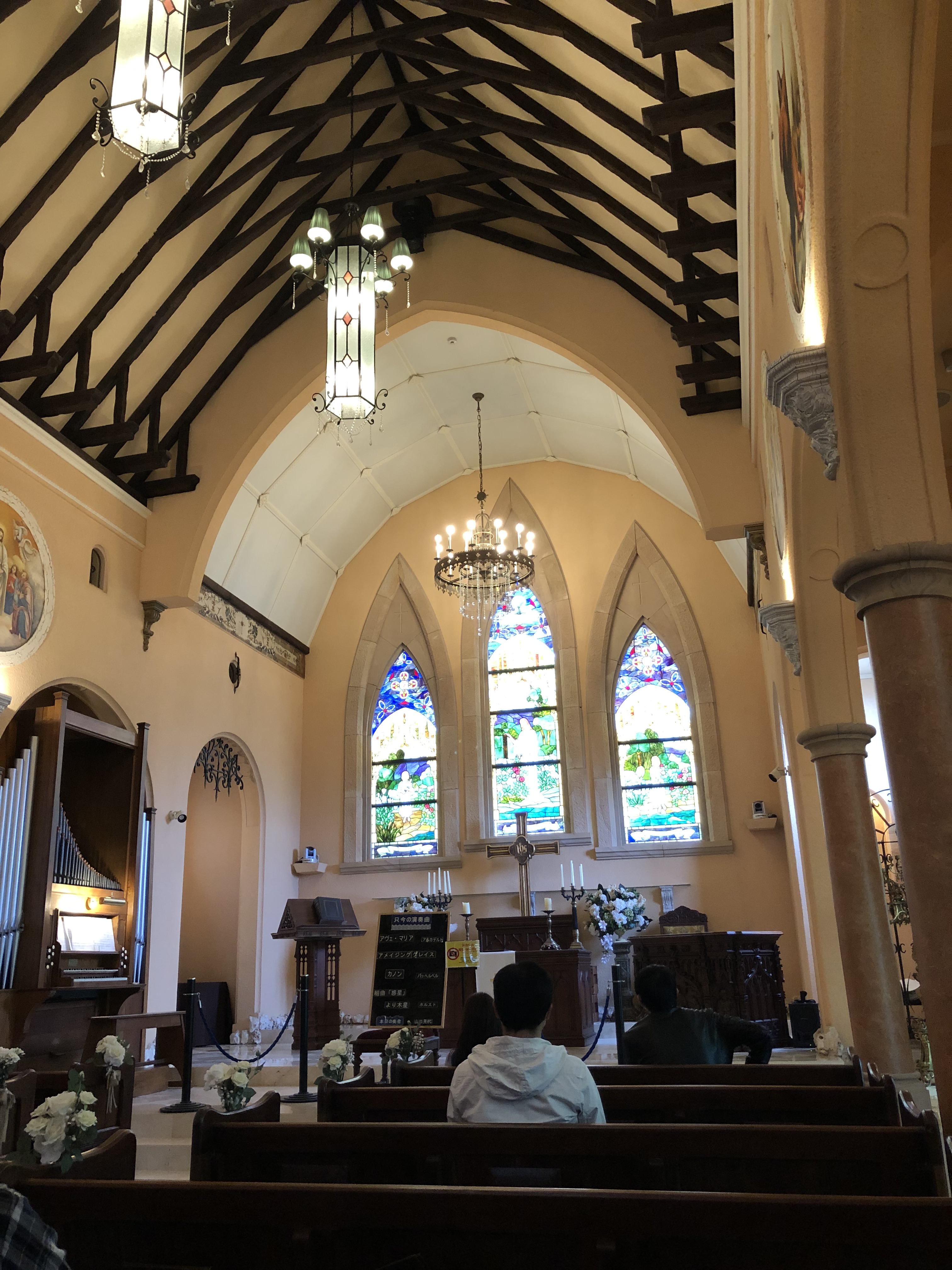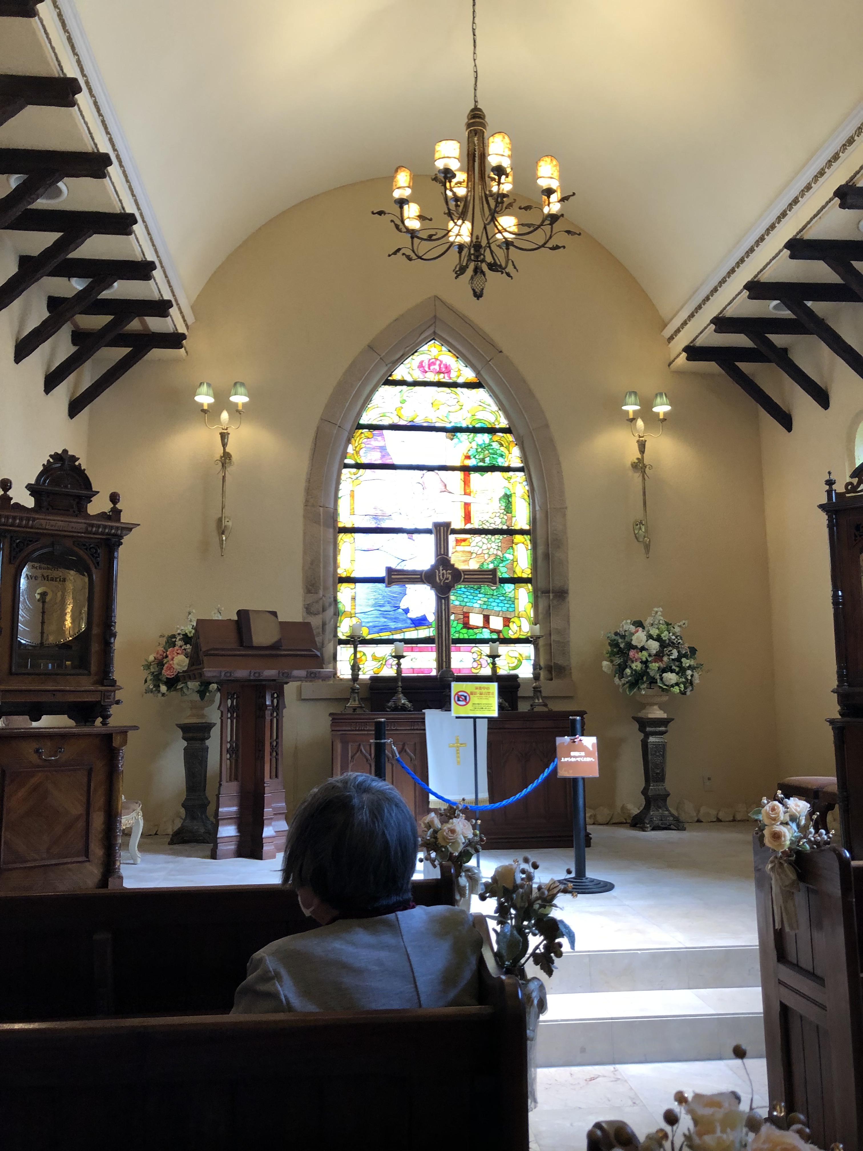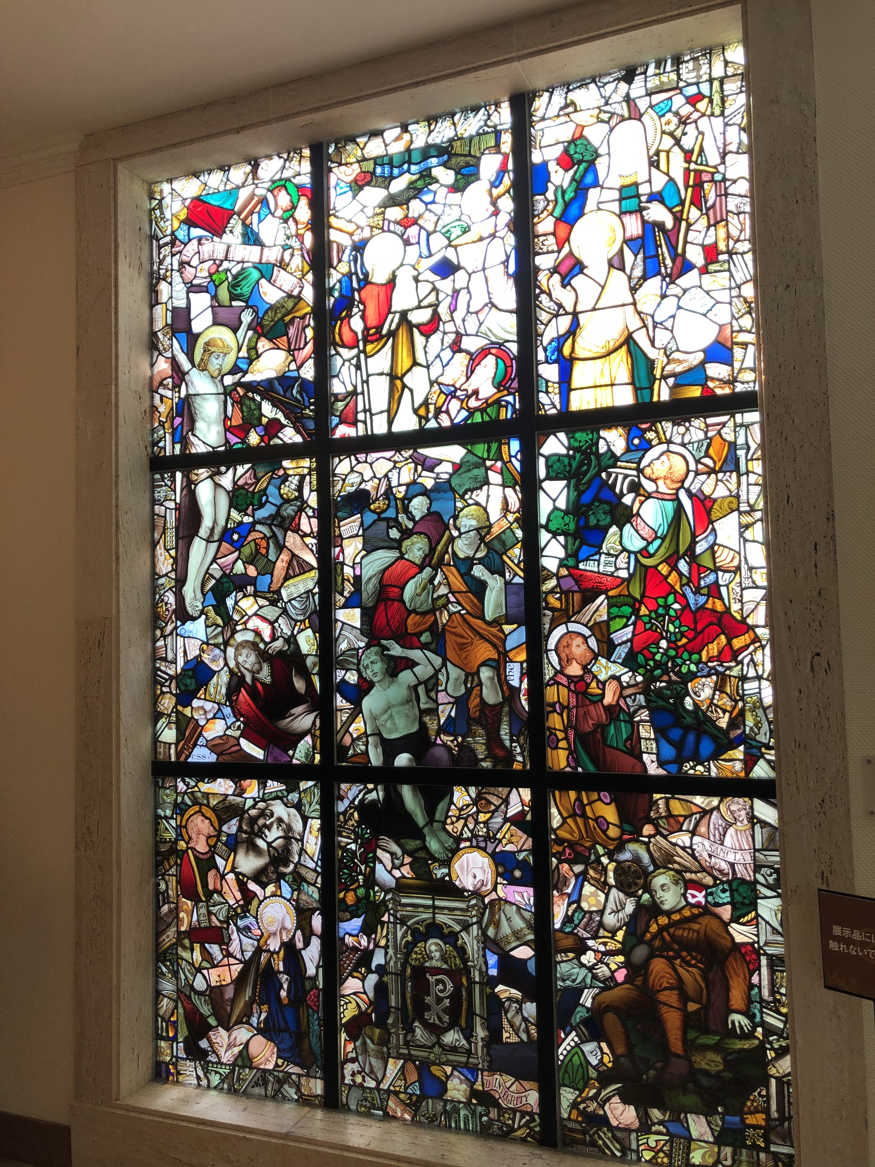 この2箇所立ち寄りで、そろそろお昼ごろとなり、目的のステンドグラス美術館では、まずレストランに入ってランチをしました。他にもオルゴールの演奏とパイプオルガンの演奏が、30分刻みで予定されていたので、それに合わせて移動。美術館の展示ルートはというと、その二つの場所を行き来する間に通過したところであることがあとでわかりました。迷路のような場所でしたが、光に生えてきれいではありました。