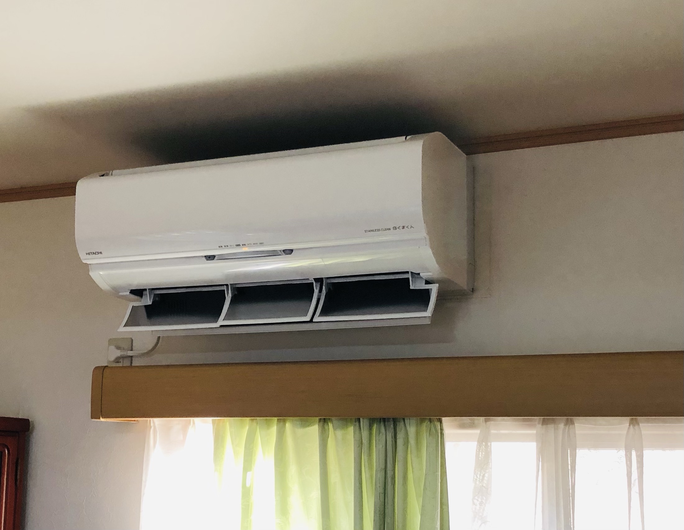 それで、換気機能のあるパナソニックやダイキンあたりで検討しようと家電量販店に行きました。今は、昔はあまりなかった20畳以上の機種が結構あり、これらの機種になると配管の太さが違うことや、低温暖房能力の強さなどもあることも確認しましたが、お店の人との会話などから日立のしろくまくんが急浮上し、こちらの23畳用を購入しました。23畳というのは鉄筋の場合で木造だと20畳ぐらいだそうです。日立にしたのは、自動お掃除機能が室外機にもあったからです。