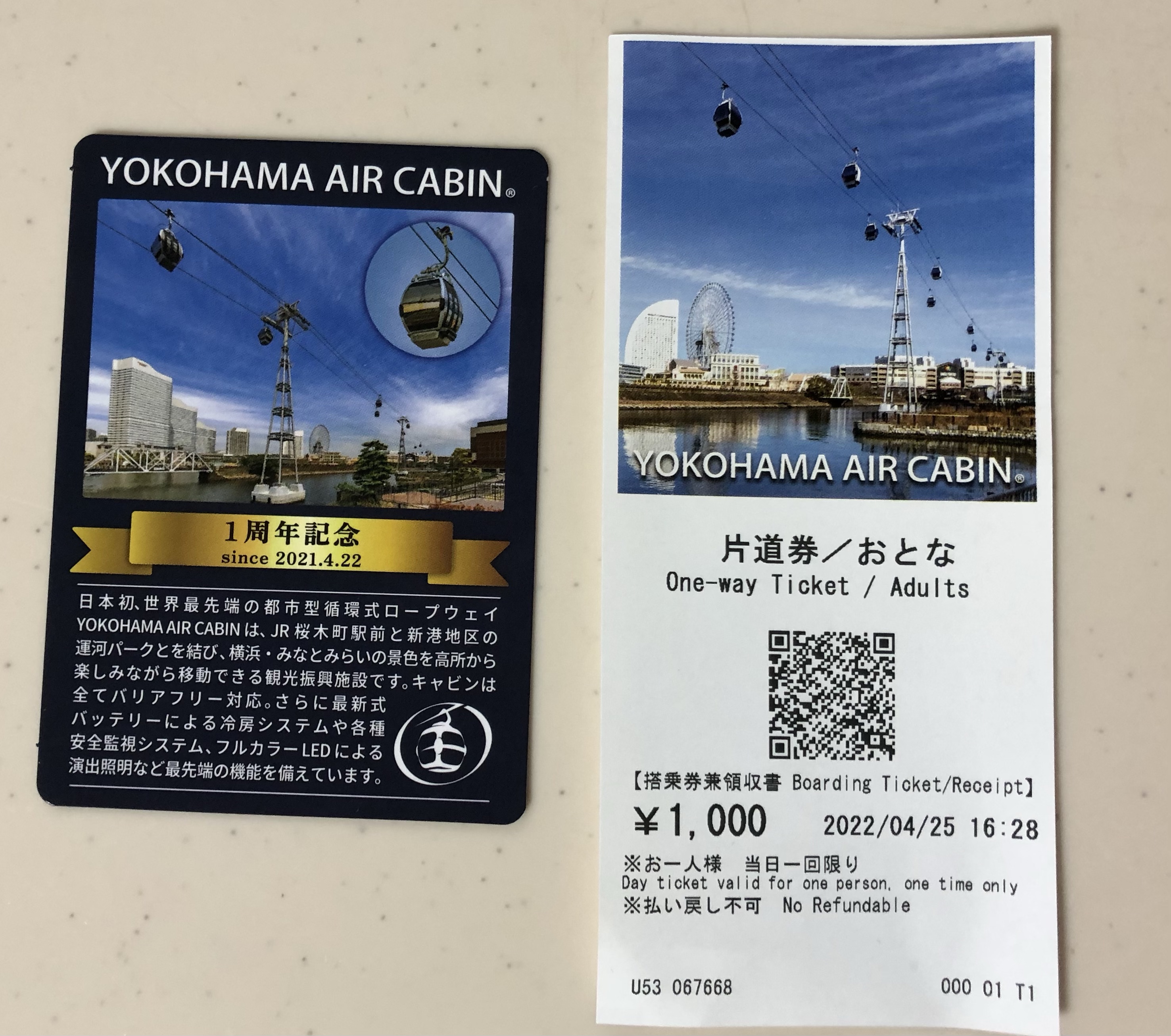 入り口だけ確認して、目的のキャビンの乗り場へ。これも、昨年出来て、1周年の記念のカードを配っていました。神奈川クーポンが使え片道切符を買って桜木町駅まで移動しました。移動時間は5分くらいですが、みなとみらいの運河の上ど真ん中を運行するなかなか快適な乗り物でした。