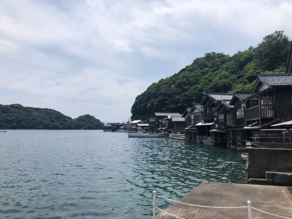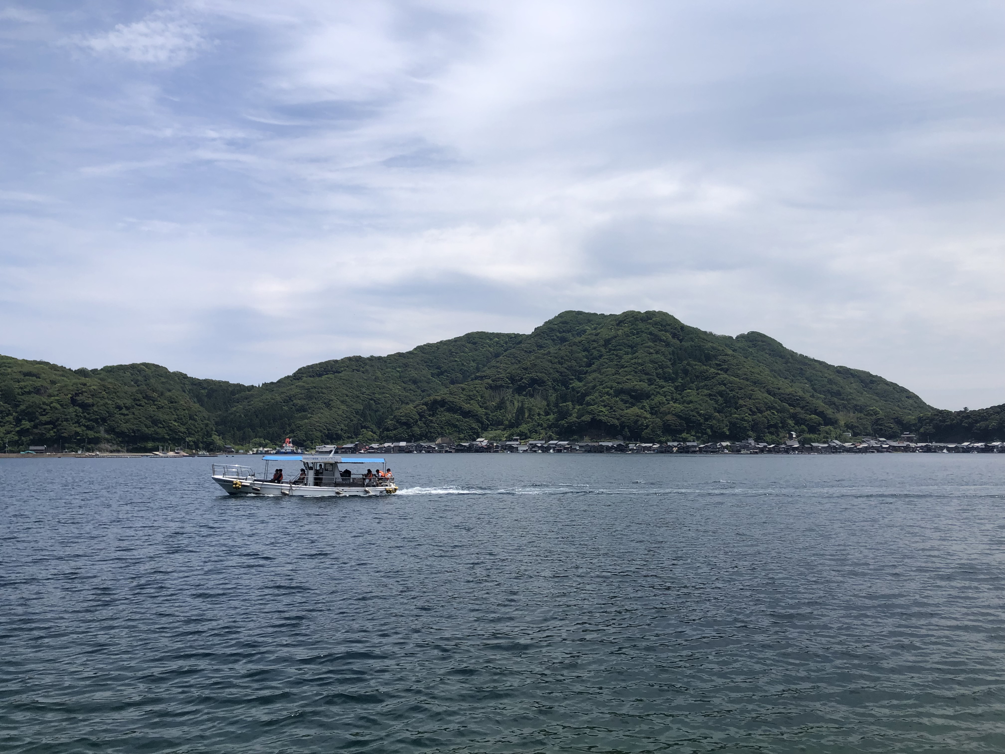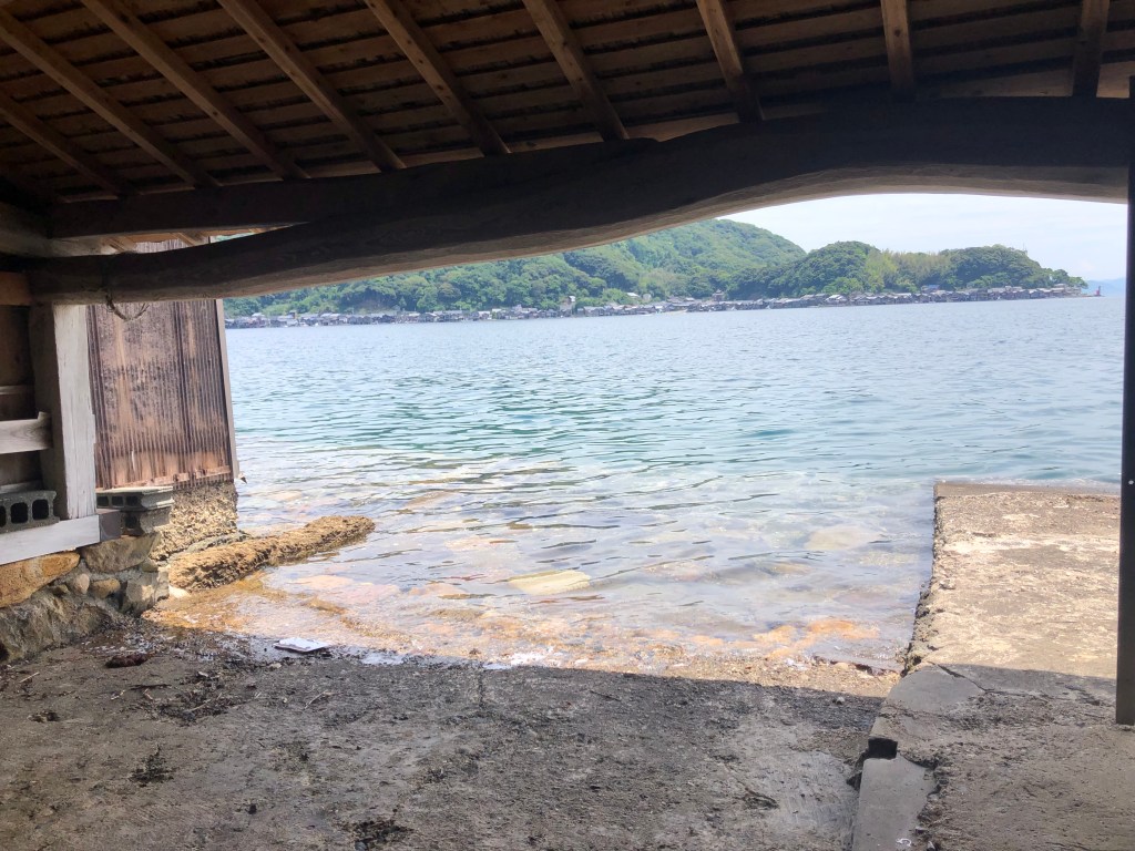 伊根湾には約230軒の舟屋があり、説明を受けた対岸の舟屋は江戸時代からのもの。舟屋の持ち主はここに住まず、道を隔てた後ろの家屋に住むのだそうです。舟屋の前がすぐ海で小さい波が寄せています。台風の時などは家ごと被害を受けないのでしょうか?