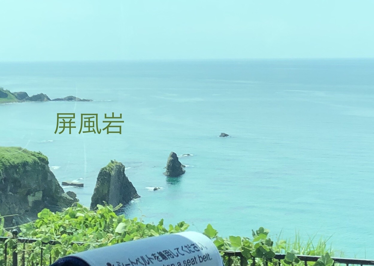 車窓からは海がずっと見えていてガイドさんが良いタイミングで見どころを案内してくださいます。形のいい兜山、ぐるっと回って一瞬ですが、丹後半島の松島と呼ばれるアングル、小さいけれども見つけられた屏風岩、など。