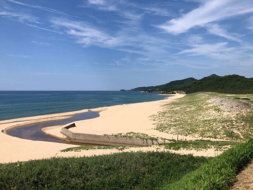 その後に立ち寄った琴引浜海岸は、とても美しい海岸でした。歩くとキュッと音がするのでこの名が付いたそうですが、普通に歩いても鳴らないそう。まずお天気が良く砂が乾燥していてきれいであり、砂をこするようにして歩くと鳴るのだそうです。砂の中に石英が混じっていてそれが擦れる音だそうです。