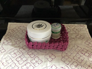 右の小さなトランクは、初めに買ったものの中にありましたが、難しそうで今回も一番最後に作りました。青い四角の篭、緑の丸い篭を先に作ったのは正解でした。貼り付け作業や、3本ねじり編みなどがこのミニトランク作りに使われていましたので。