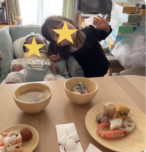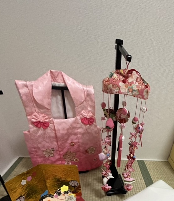 2つ目、百日のお食い初めの日には、ビデオ通話をくれてスクリーンショットで何枚か写真が撮れました。お姉ちゃんYKちゃんはすっかりいいお姉ちゃんでポーズしてくれました。3つ目、3月3日のお雛祭りは初節句なので、お祝いを渡しましたら、お飾りの前で撮った写真がlineで送られてきました。