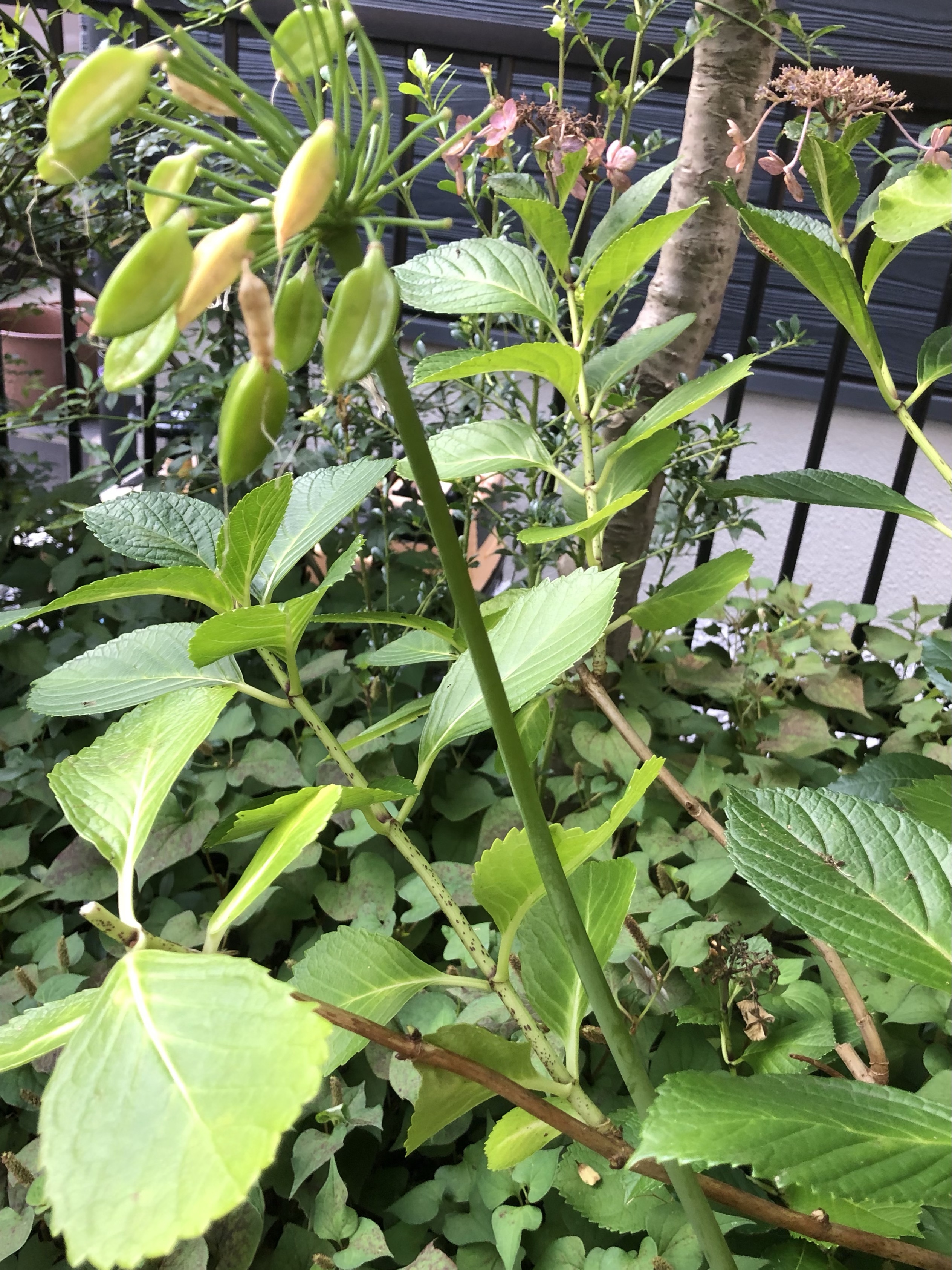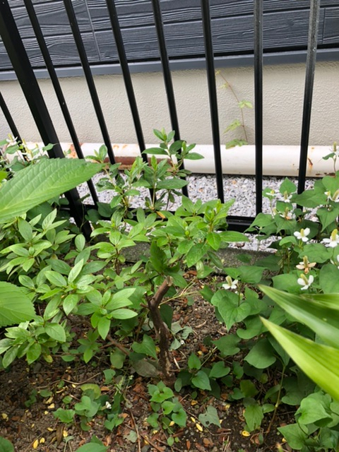 地面を埋め尽くす雑草は自由な出自ですが、鬱蒼となる前に草とりをしてドクダミ、カタバミ、雪ノ下を保護しています。その結果、6月はドクダミの白い花がうちの庭を埋め尽くします。この季節かつてはクチナシの白い花もあったのですが、葡萄の勢いにショックを受けて退場しました。