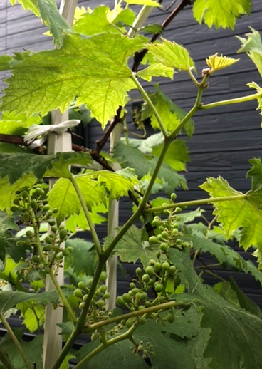 このブドウは、以前はイチジクを植えてあった場所に植えたもので、山梨に出かけたときに苗木として売られていたのを購入しました。確か3本買いましたが、この1本だけが育ってくれました。昨年、一昨年は葉を伸ばすばかりでしたが、昨年の夏の終わりにブドウの実らしきものがようやくつきました。冬が来て初めての実は育ちませんでしたが、春が来て期待通り実をつけてくれたのです。