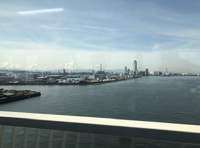 いざ行ってみると、8時台の予約の人の多いこと!乗り場まで大きく回されて、並び待ち、無事電子切符上手くOK,通過、次々とくるバスに乗り込みました。乗ったタイミングで座れず、立ったまま海の景色を眺めながら25分万博会場にたどり着きました。