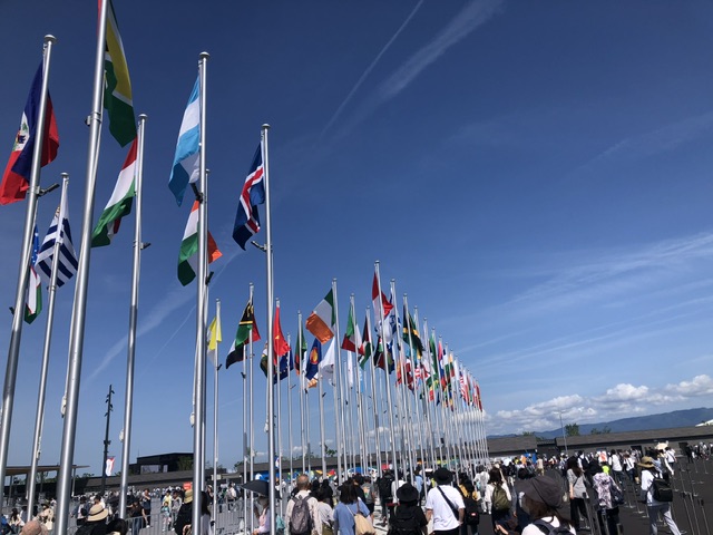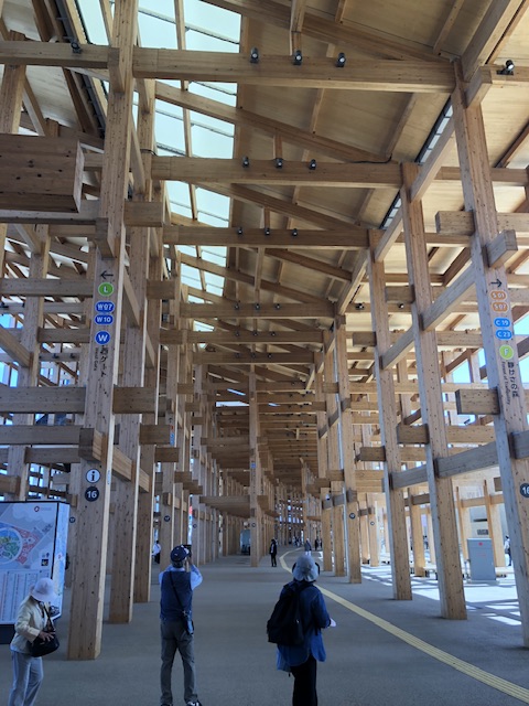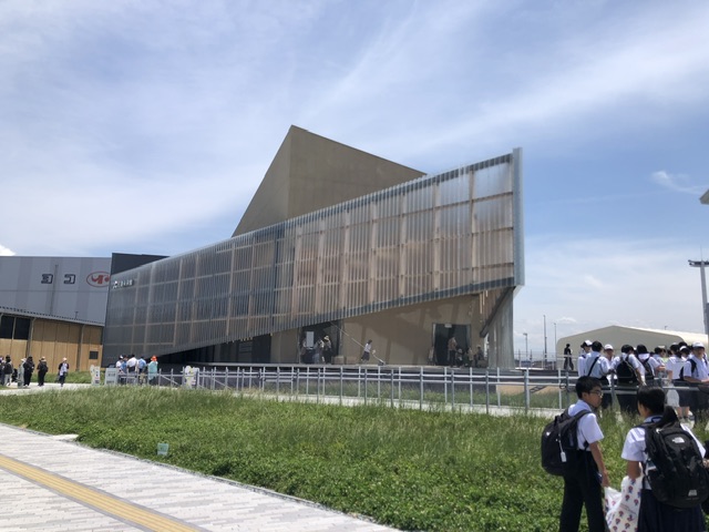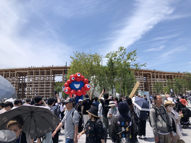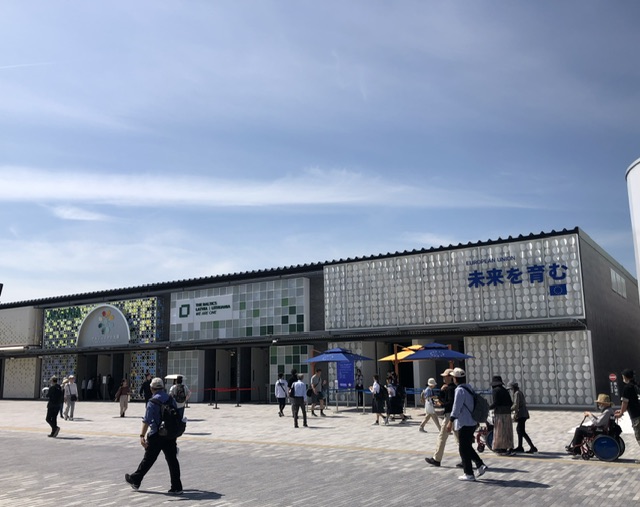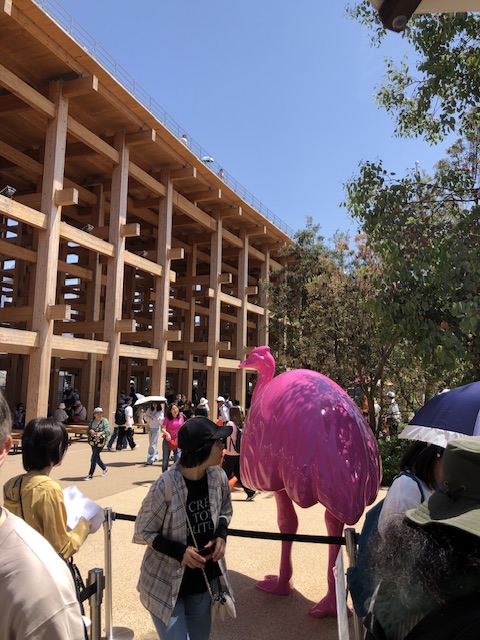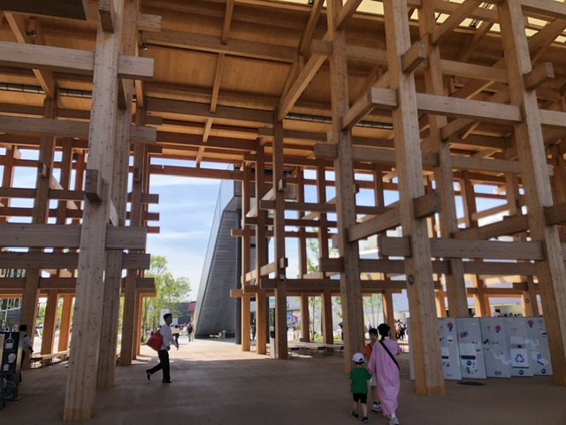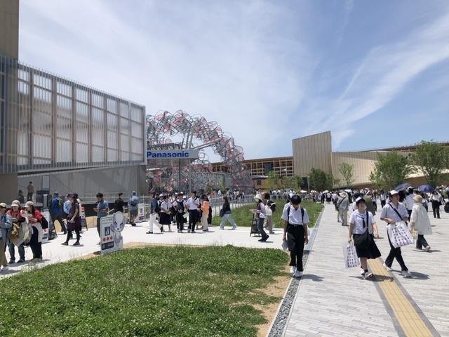 下に降りると、人が増えてきているのが明らかに感じられ、団体の子どもたちも見かけました。大屋根リングの下のいくつかにキッチンカーのようなお土産販売車が止まっていて、物色したりしているうちに時間も過ぎ、退場予定の12時40分が近づいて来たので東ゲート付近へと移動。