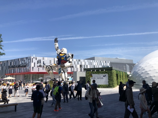 西ゲートは、帰りの東ゲートと比べ裏側感は否めませんが、こちらにもみゃくみゃくがお出迎えで思わず記念撮影を何枚も! 周辺にはガンダムの館とモニュメント、吉本の丸い笑顔のパビリオンが見えました。うわさの大屋根リングの下は影で涼しく、その先にはエスカレーターも見えました。
