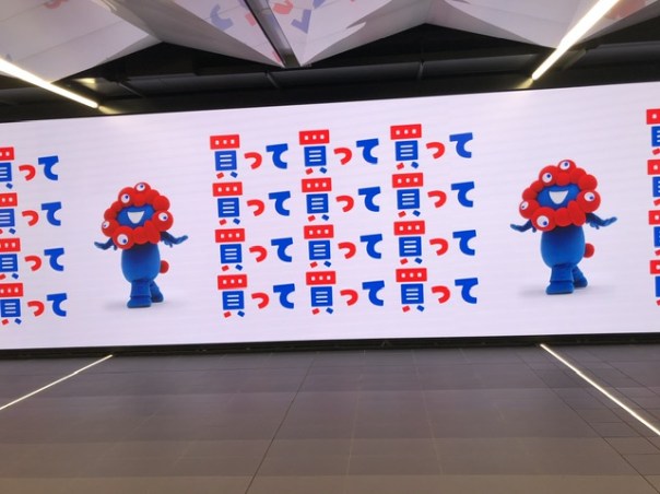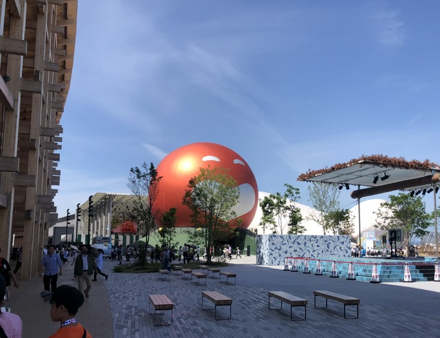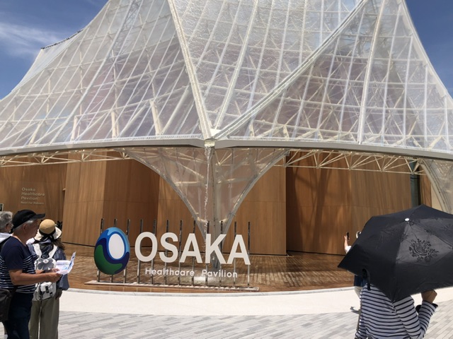 こちらはメインゲートにふさわしい空間の広がりの中、日付の付いたみゃくみゃくスポット。NTT、大阪ヘルスケア、パナソニック、三菱、などのパビリオンが並んでいました。オフィシャルショップもゲート付近にあり、ここも昼間から入場するのにも行列ができていました。